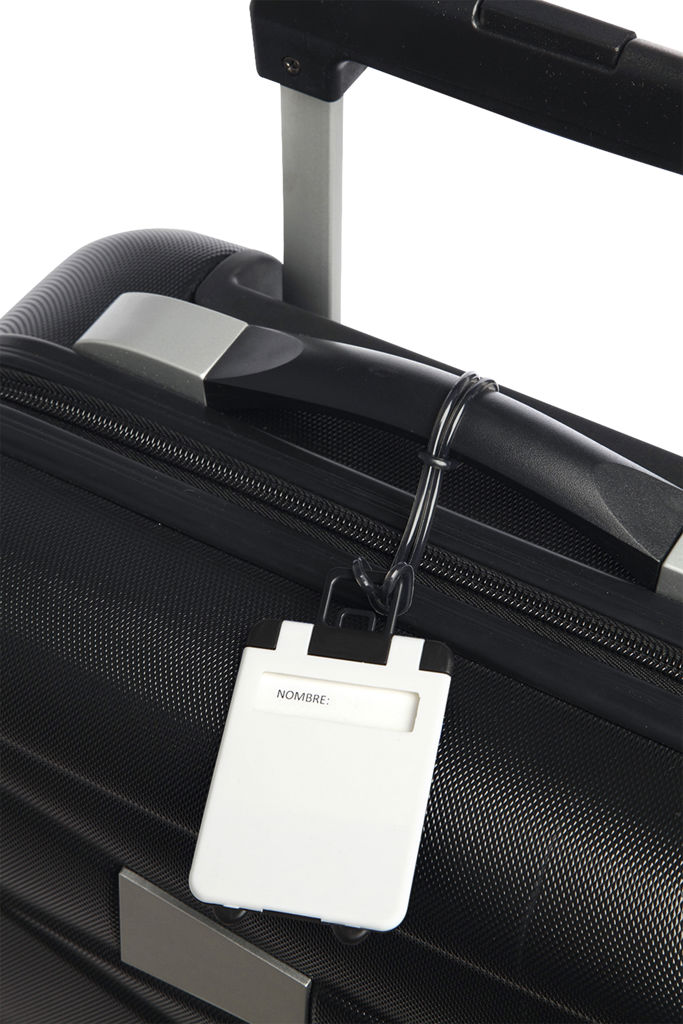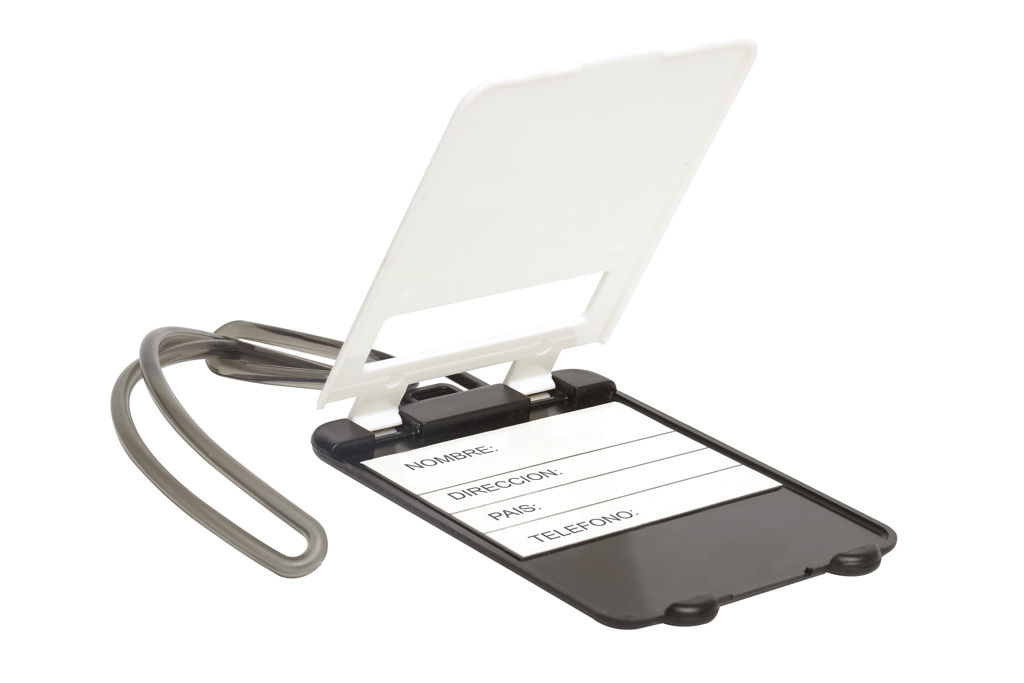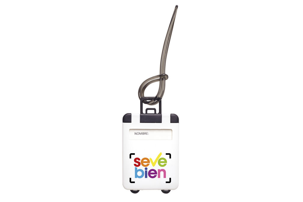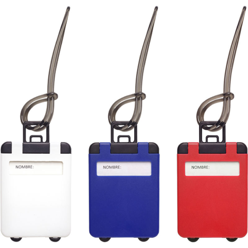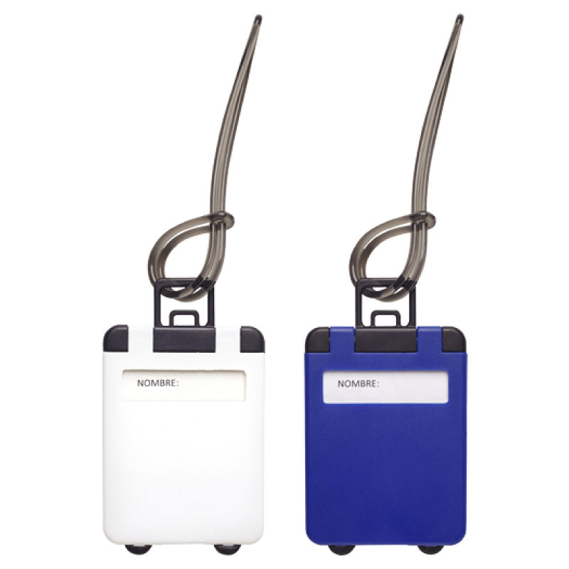 5,4 x 9 cm. Plástico. Identificador en forma de valija / maleta. Cuenta con etiqueta para datos personales. Lazo de plástico para colgar en la manija del equipaje.