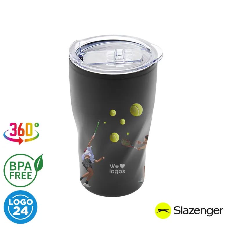 Jarro térmico Deuce de Slazenger realizado en acero inoxidable en su exterior, y polipropileno de color negro en su interior, con tapa cristal clear. Producto aprobado por el I.N.A.L. para el contacto con alimentos.
