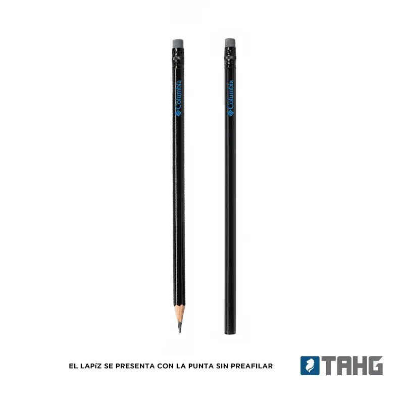 Lápiz negro con goma. Realizado en madera con detalle de aluminio en reborde de goma. Material de la goma: Caucho. Punta sin preafilar.