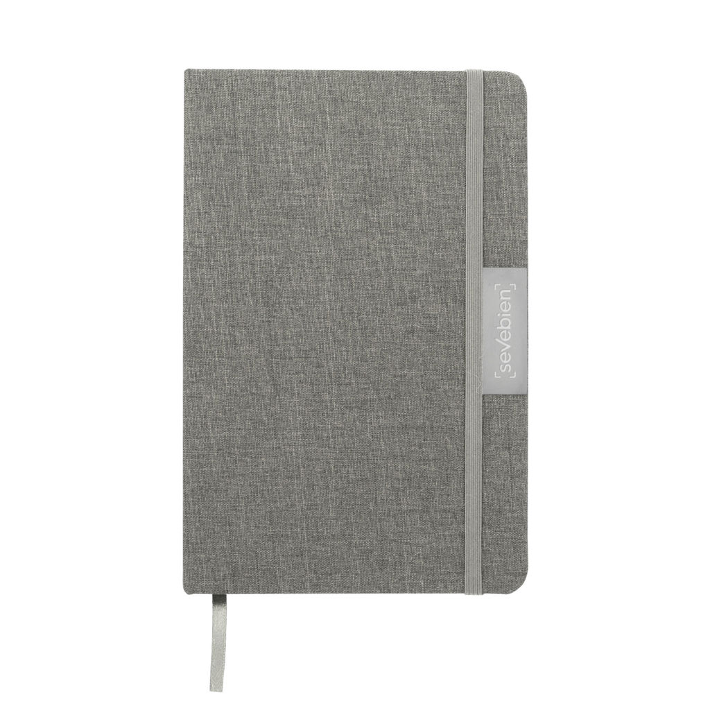 Sostenibilidad elegante.Libreta con placa metálica. Tapa de cartón de 300g recubierta en RPET 310. Placa metálica de 5 x 2 cm. Interior de 80 hojas rayadas en papel obra de 70g. Encuadernación cosida. Cierre con banda elástica del mismo color de la tapa.Medidas: 14 x 21 x 1,5 cm.