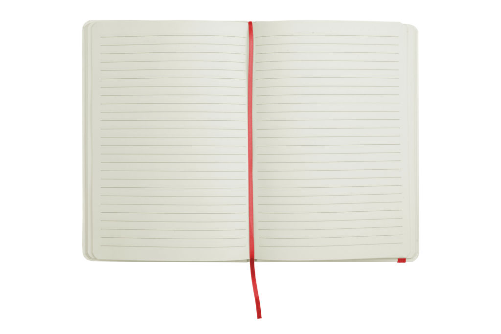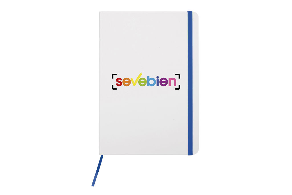 Cartón. 21 x 14,5 x 1,2 cm. Tamaño similar a A5. Libreta de tapa dura color blanco. Contiene 80 hojas rayadas. Posee cierre con banda elástica y separador en tela del mismo color.