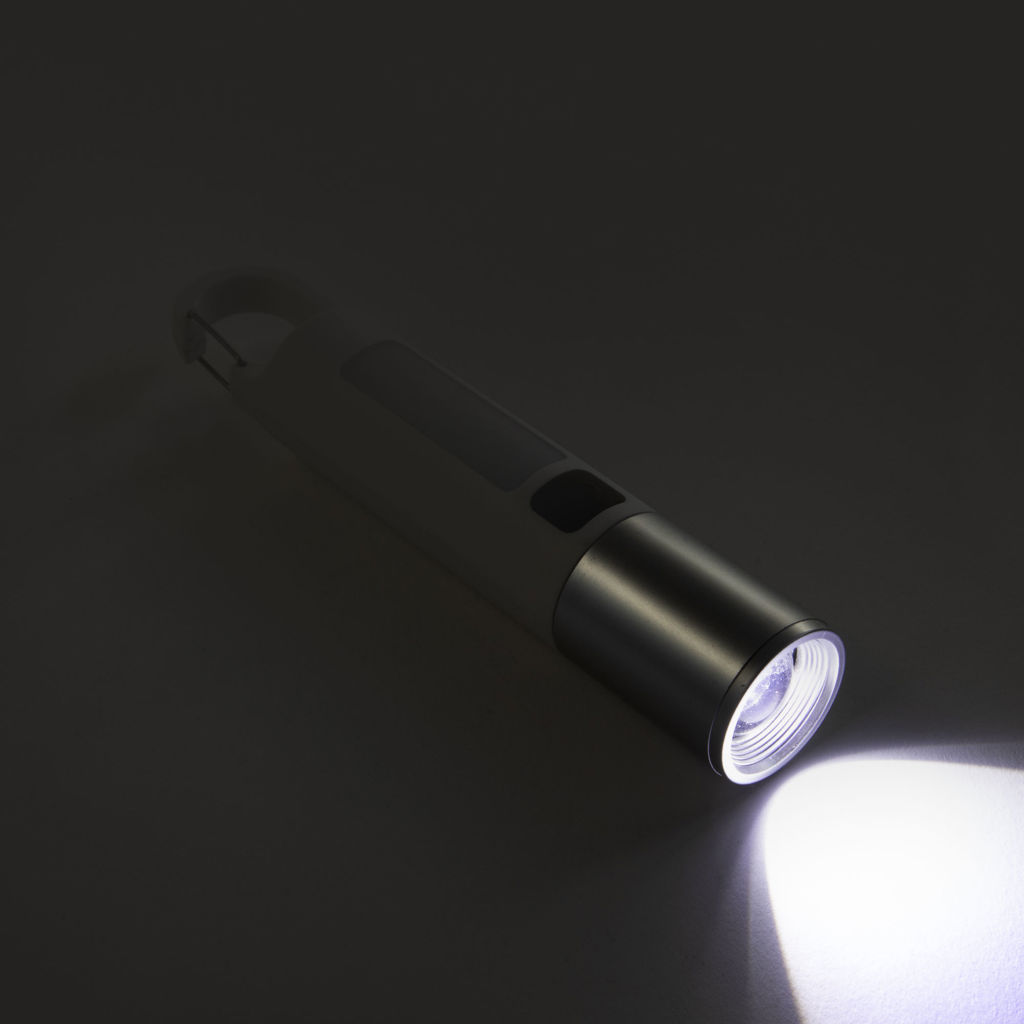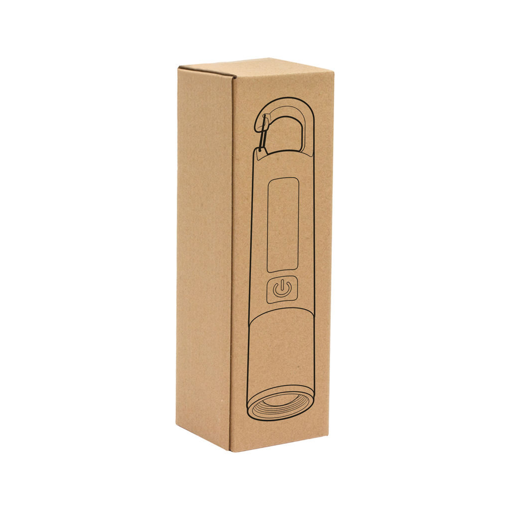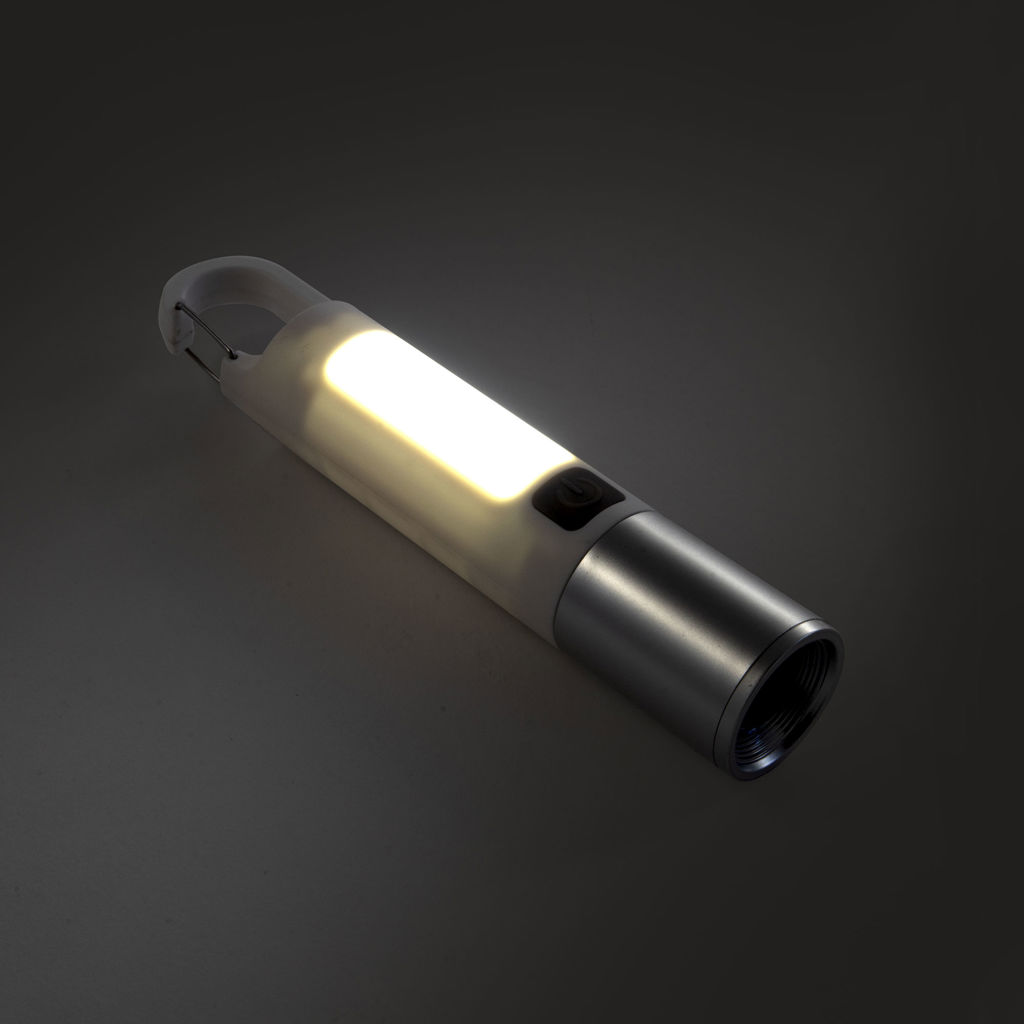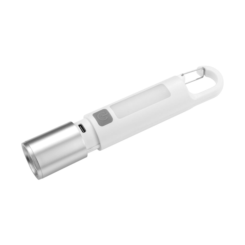 Luz potente siempre a tu alcance.Linterna portátil recargable. Con mosquetón incorporado. Luz de emergencia y 2 intensidades de iluminación (alta e intermitente). Batería recargable 800 mAh. Fuente de luz 7 leds de alta potencia. Puerto USB-C oculto (se desplaza el cuerpo hacia arriba). Cable de carga color blanco. Medidas: Ø 3 cm x 15,8 cm.