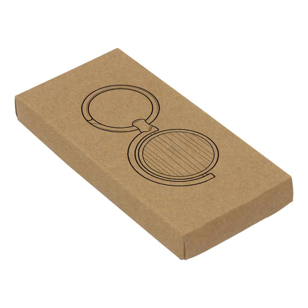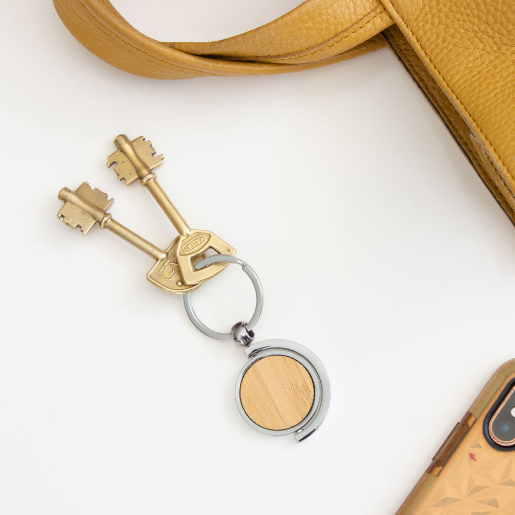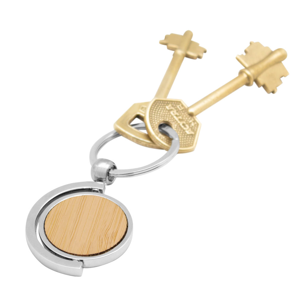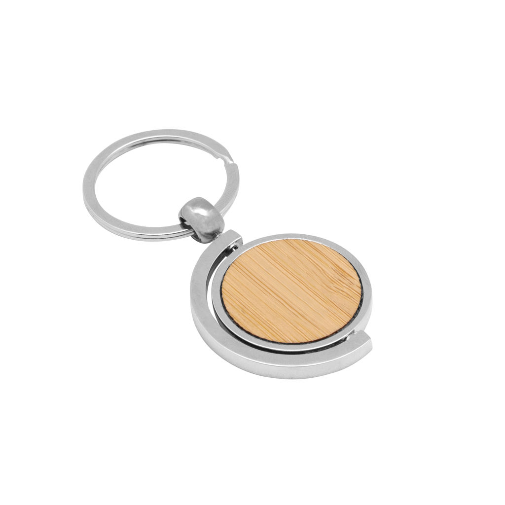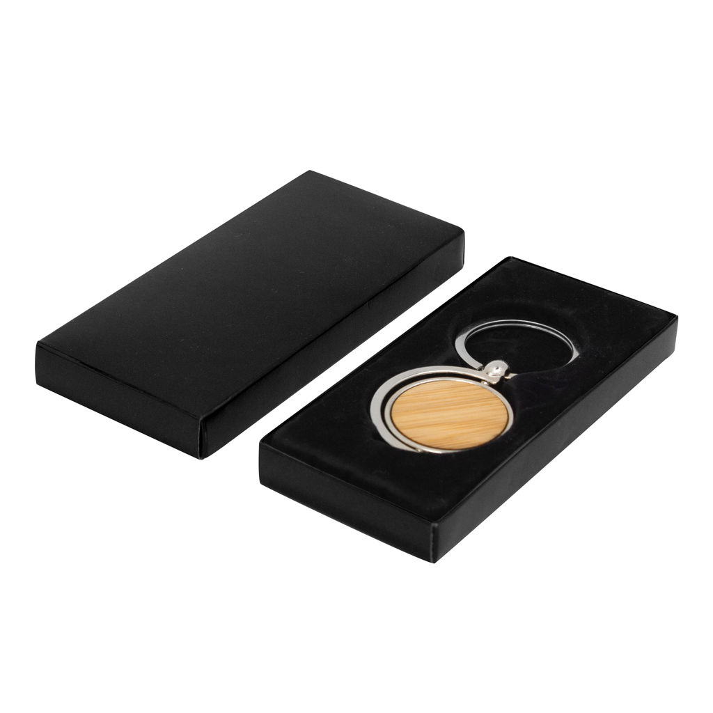 7,5 x 3,5 x 0,4 cm. Llavero circular de bambú con detalles metálicos. Estructura giratoria 360°. Presentación en caja de regalo.