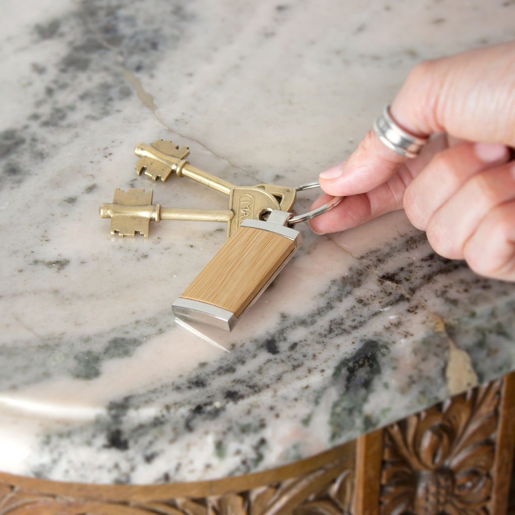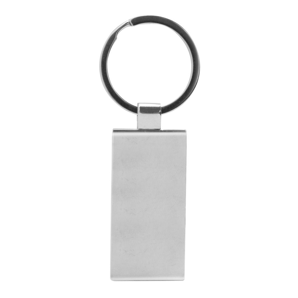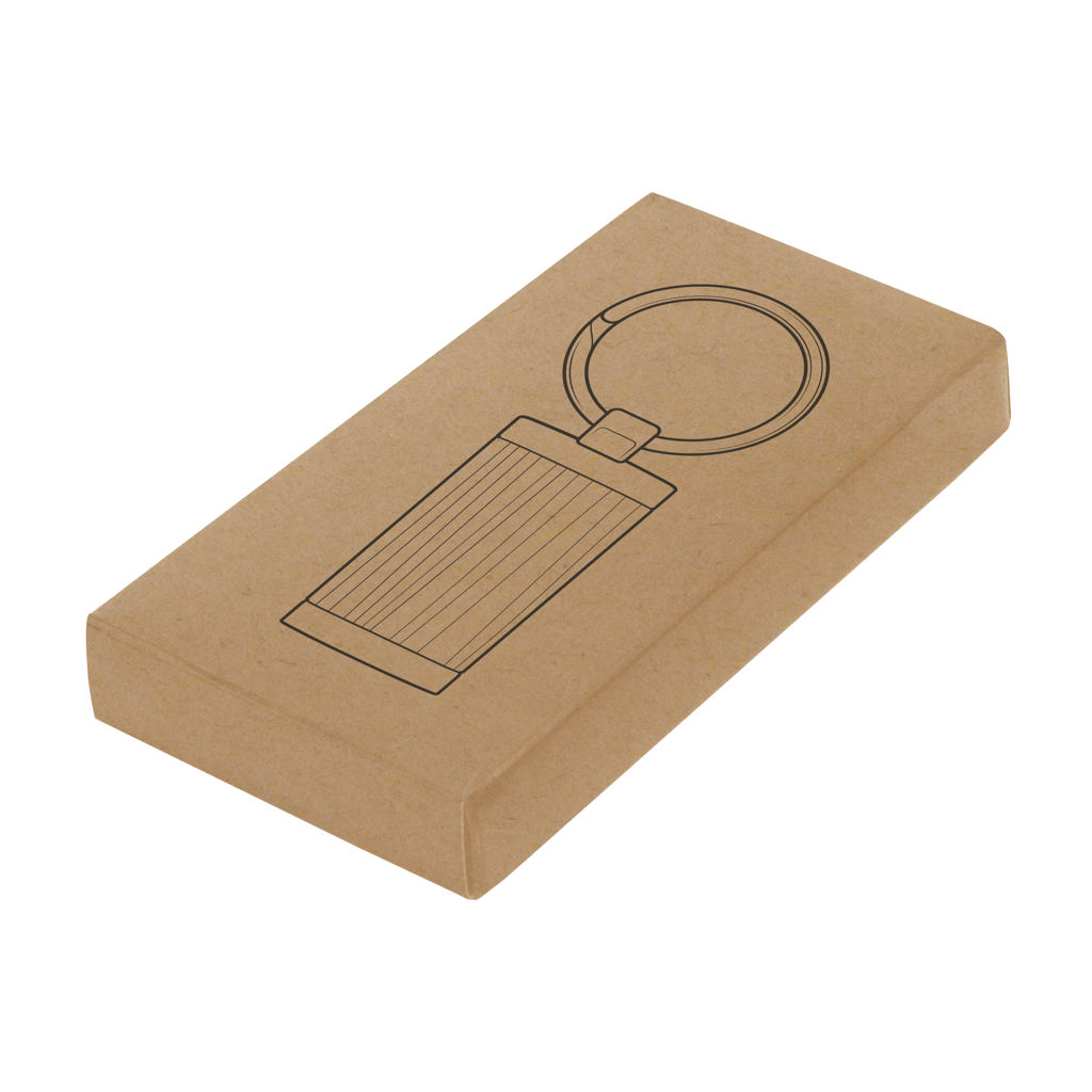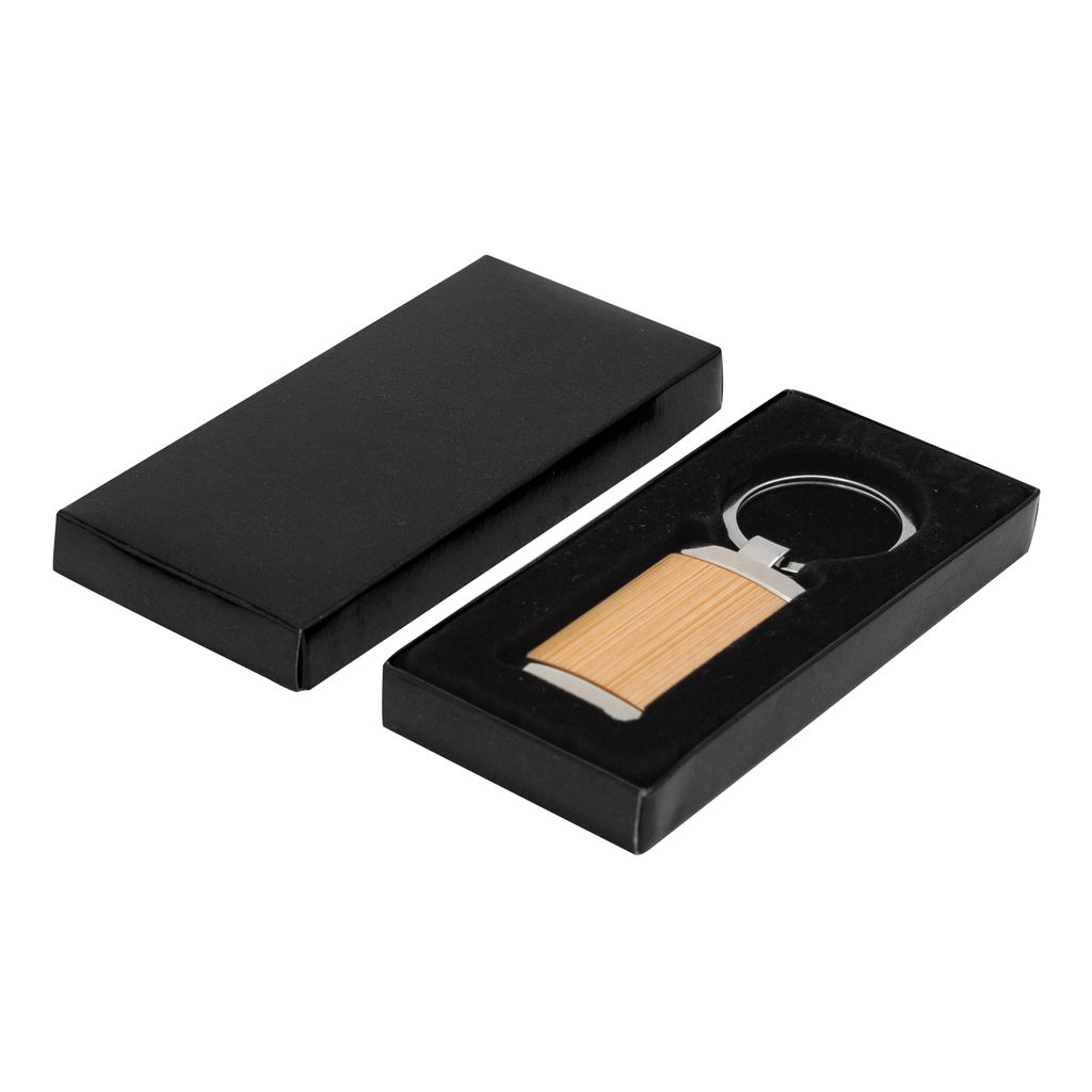 8,5 x 2,4 x 0,6 cm. Llavero rectangular de bambú con detalles metálicos. Presentación en caja de regalo.
