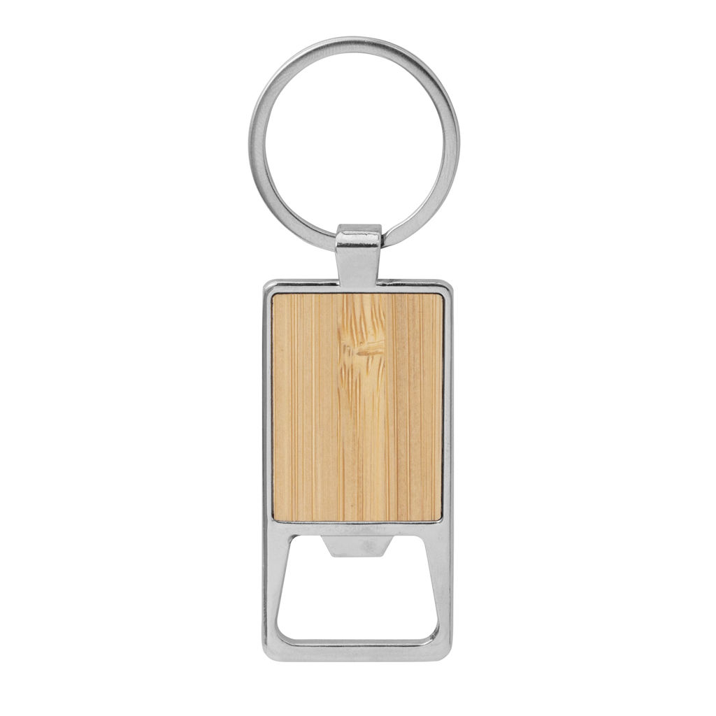Funcionalidad y estilo.Llavero con destapador abre botellas. Estructura metálica con aleación de zinc con acabado brillante y panel frontal de bambú barnizadoMedidas: 6 x 3,2 x 3,5 cm.