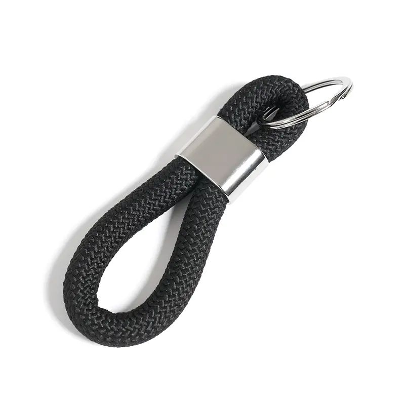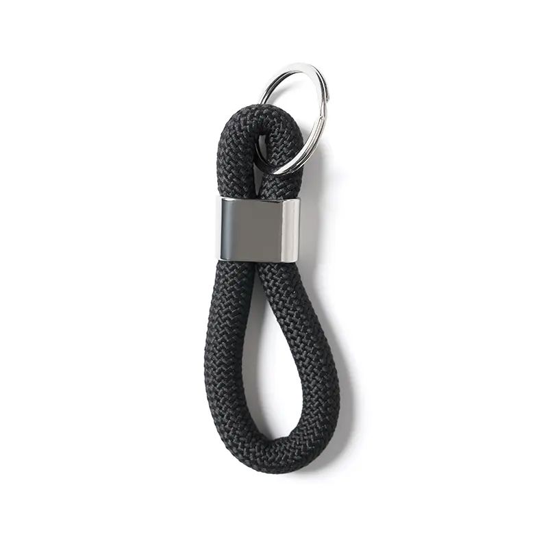 Llavero con diseño en forma de lazo, elaborado en cuerda resistente con terminaciones metálicas en satinado plateado. Hecho para brindar durabilidad y estética, cuenta con anillo de metal para sujeción segura y estilo minimalista. Es ideal para regalos promocionales o uso personal y para acompañar las llaves con un toque distintivo, práctico y moderno.