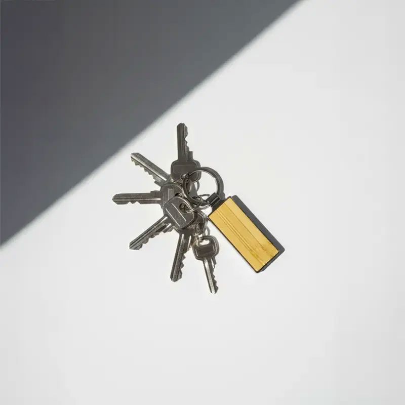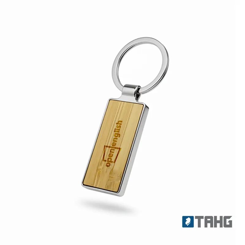 Llavero metálico con cara de bambú. Fabricado en aleación de zinc y bambú en color natural. Cuenta con anilla duradera y diseño alargado y minimalista. Es ideal para merchandising ecológico, campañas publicitarias y uso diario.