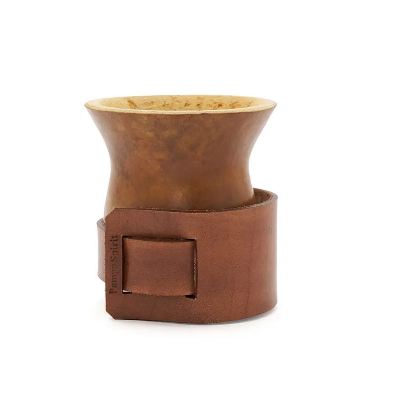 Mate de calabaza natural seleccionada y pulida, montada sobre un cinturón regulable de cuero vaqueta vacuno. Su base de cuero brinda firmeza, y su capacidad lo hace ideal para disfrutar largas rondas de mate en cualquier entorno. Incluye bombilla de acero inoxidable con resorte y una bolsa de algodón de 20 x 20cm.