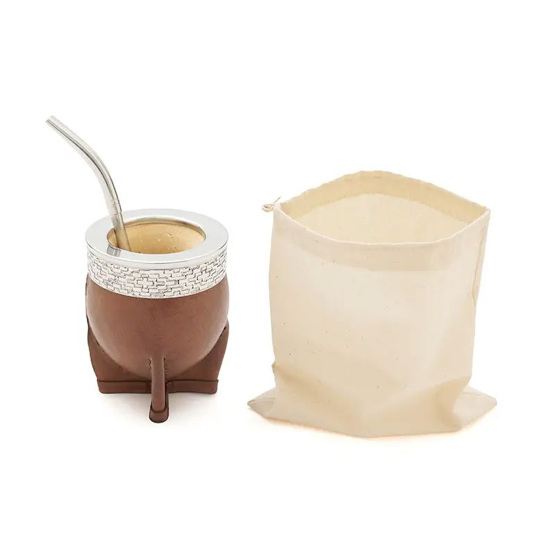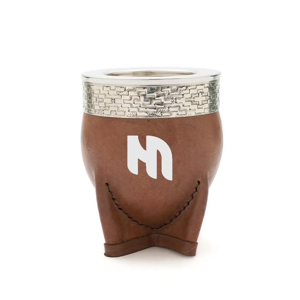 Mate de calabaza tipo imperial modelado en cuero vaqueta vacuno, cuenta con virola superior de acero inoxidable pulido espejo con un diseño de guarda pampa grabado. Ideal para uso diario, regalos corporativos o como producto destacado en tiendas especializadas. Incluye bombilla pico de loro y una bolsa de algodón de 20 x 20cm.