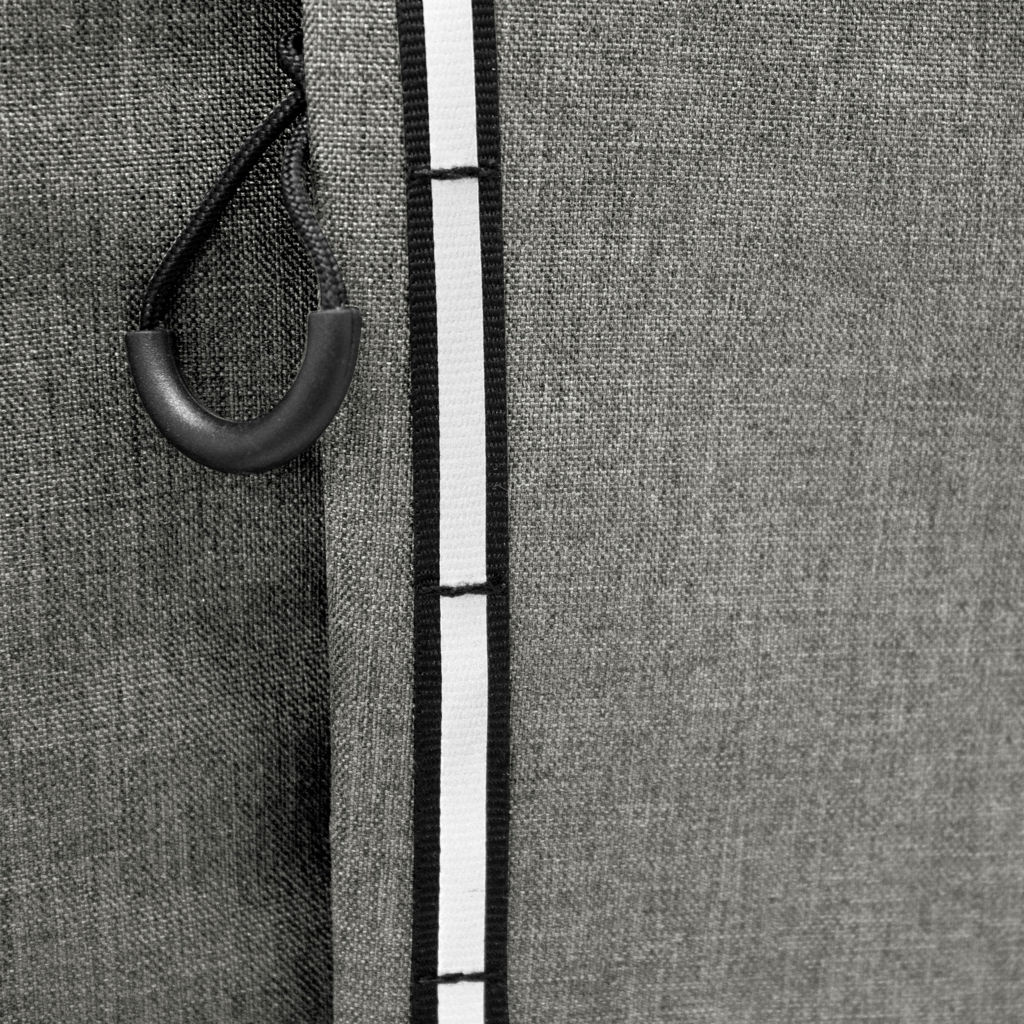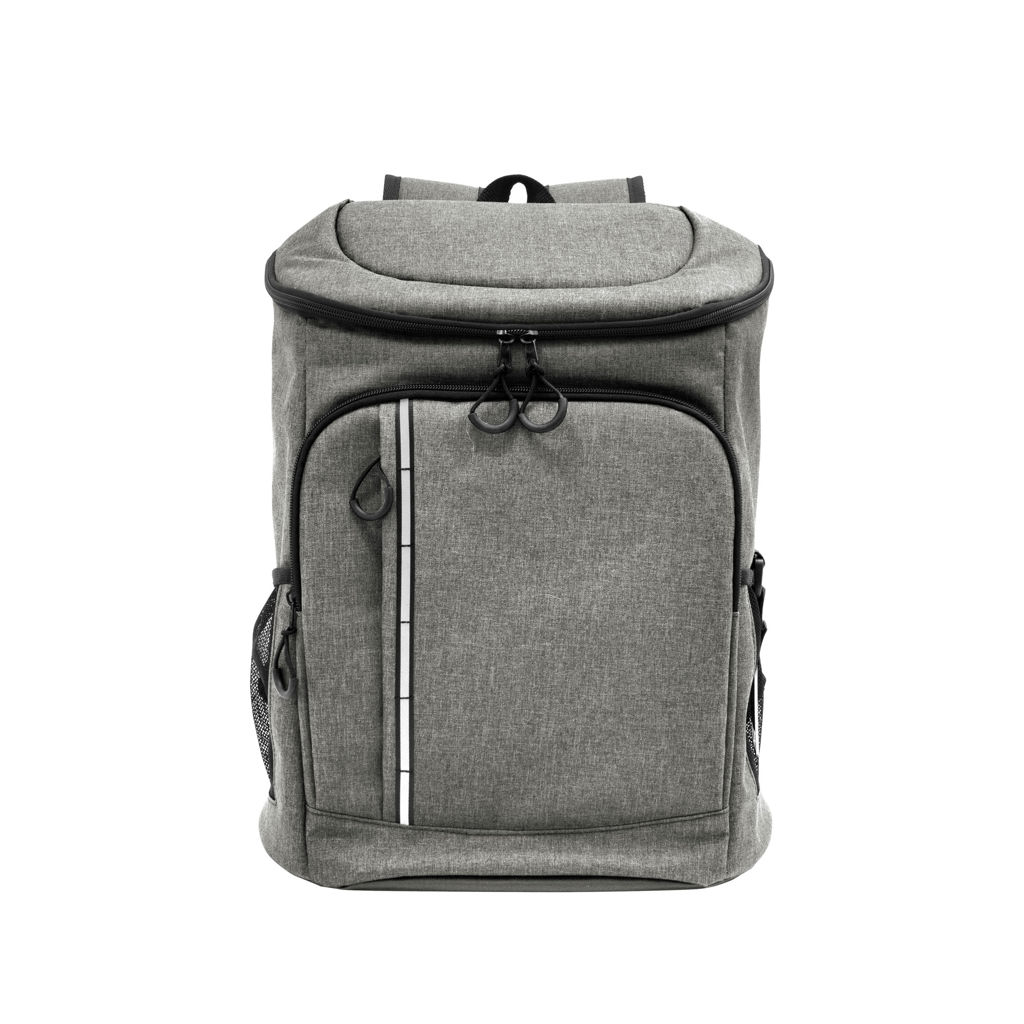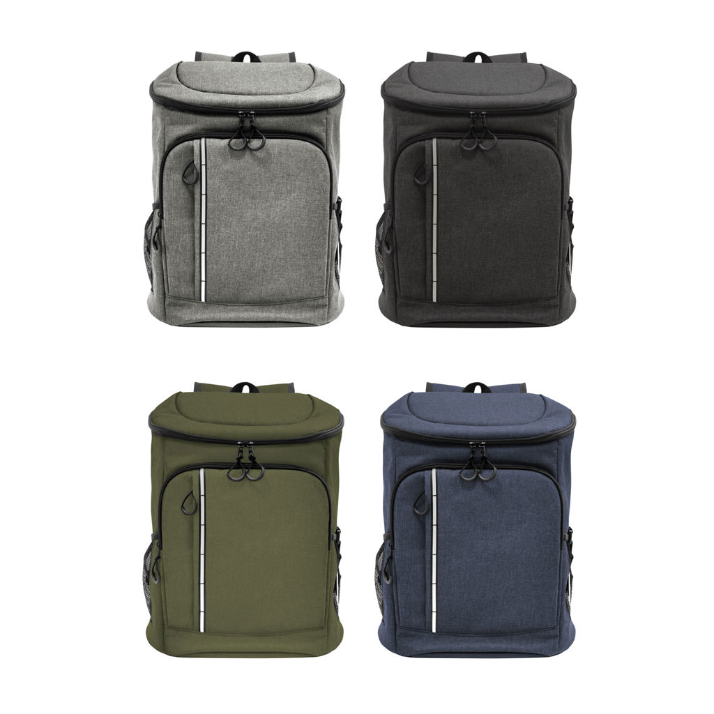 29 x 43 x 18 cm. Capacidad 18 litros aprox. Poliéster Wulong 300D + Interior forrado en PEVA color plata con relleno de espuma de PE. Mochila cooler. Compartimento principal con cierre en la parte superior. Compartimento frontal con cierre, bolsillo interno de red con cierre y bolsillo externo vertical con cierre y banda reflectante. Dos bolsillos laterales de red multipropósito. Incluye abridor de botellas de acero inoxidable (6,3 x 3,3 cm) extraíble. Correas regulables acolchadas. Cierres metálicos. Tiradores de cierre plásticos en forma de U de color negro.