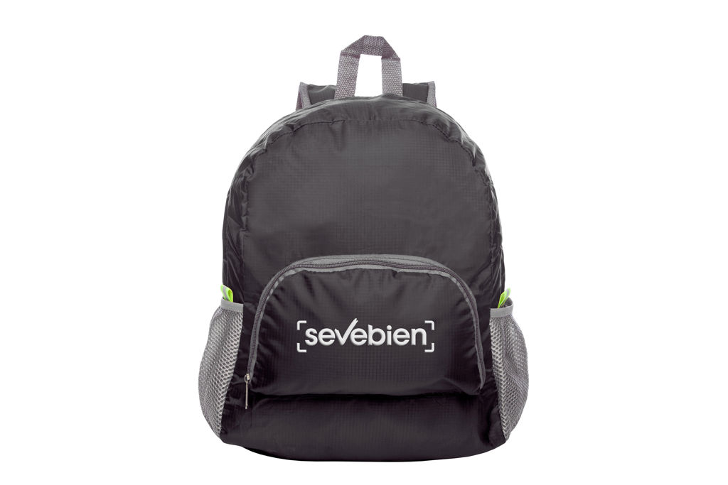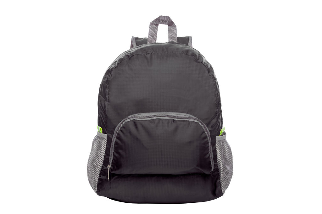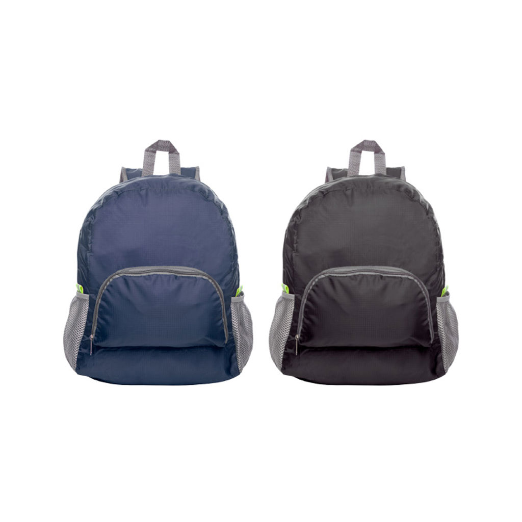 25 x 40 x 15,5 cm. (abierta). 23 x 13 x 2,5 cm (cerrada). Capacidad 12,5 litros aprox. Ripstop 210T (Tela ligera y resistente, de alta durabiidad y protección antidesgarro). Mochila plegable. Bolsillos laterales de red en color gris con tiras amarillas reflectivas en ambos lados. Detalles en gris en la manija y el cierre.