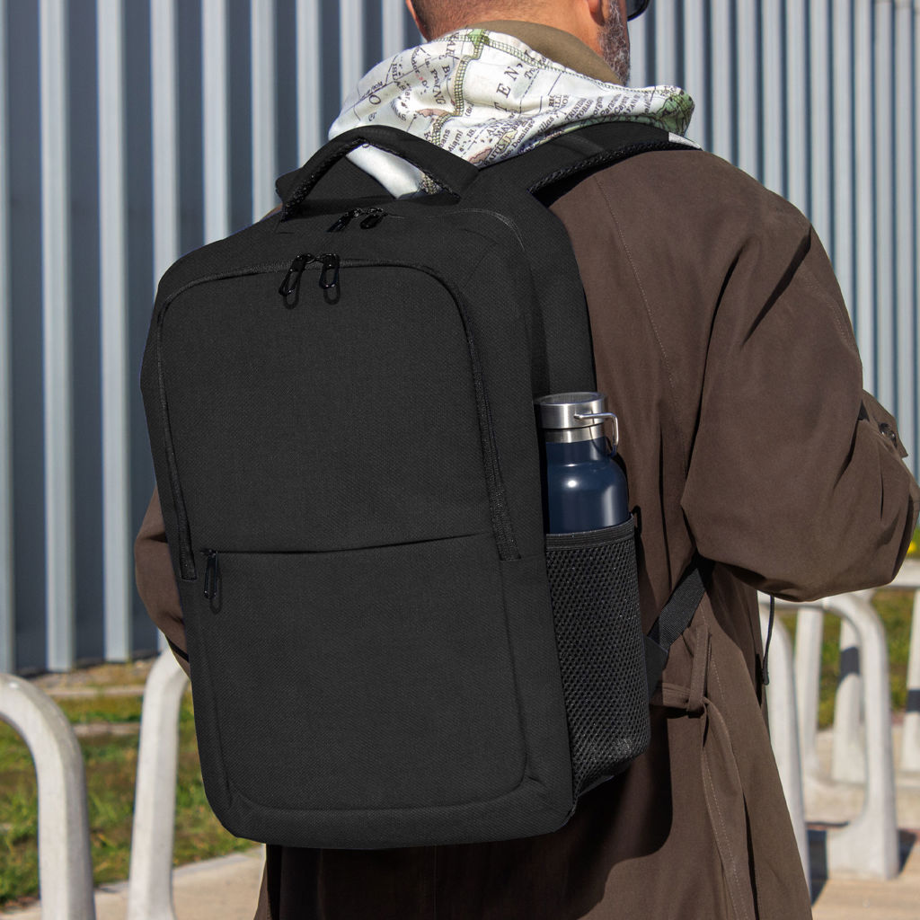 Viaja con confianza.Mochila portanotebook de hasta 16 pulgadas. Cuenta con dos compartimentos, el compartimento principal con bolsillo acolchado para la notebook y bolsillo organizador. frente con bolsillo horizontal con cierre y 2 bolsillos laterales de malla porta botellas y accesorios. Asa superior, correas y respaldo acolchados. Correas ajustables. Tira para sujetar la mochila en la manija extensible de un equipaje de mano. Tiradores de cierres metálicos color negro.Medidas: 44 x 30 x 15 cm.