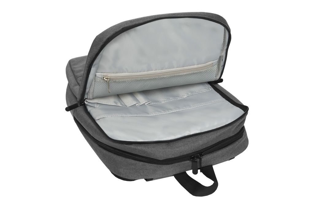 28 x 42 x 12 cm. Capacidad 14 litros aprox. Tela de yute – imitación. Poliéster 100%. Mochila portanotebook de hasta 16 pulgadas. Amplio bolsillo frontal con cierre lateral. Posee 2 compartimentos acolchados y forrados. El primero con un bolsillo de red con cierre, organizador con pequeños bolsillos, porta boligrafos y espacio para guardar una tablet. El segundo compartimento contiene bolsillo para notebook de hasta 15″. Correas ajustables y espalda acolchadas con tela de red que permite la ventilación. Tiradores de cierres metálicos.