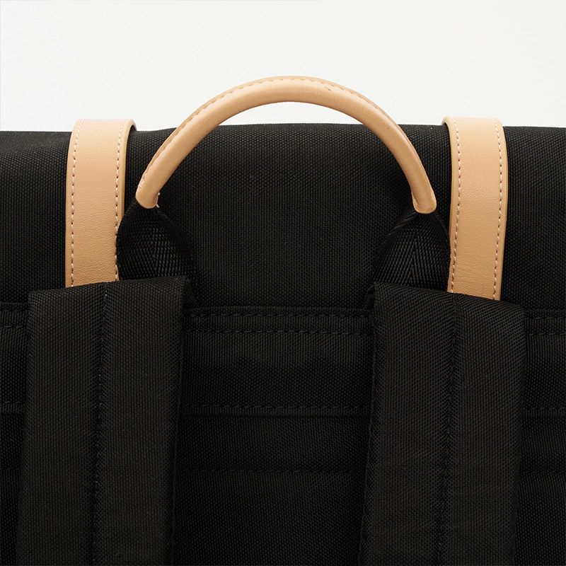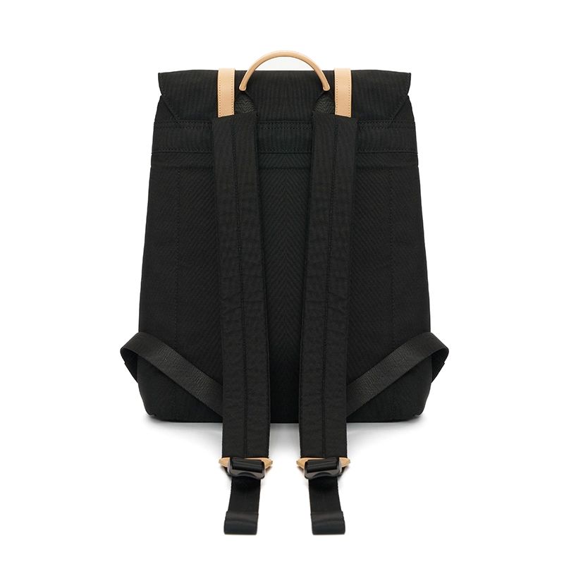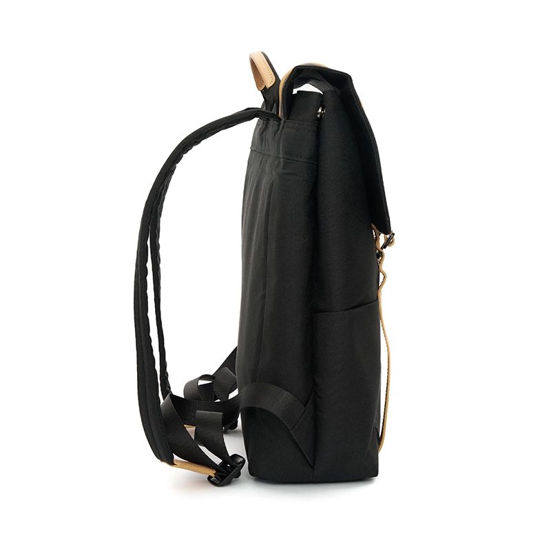 Mochila tipo urbana con solapa y broches metálicos, confeccionada en poliéster reciclado 600D. Cuenta con compartimiento principal bajo la solapa y tiras ajustables. En su interior cuenta con un espacio para PC, un bolsillo para transportar una botella, y otro pequeño con cierre para llevar objetos pequeños. Incluye manija superior, diseño estructurado y costuras reforzadas que aportan durabilidad.