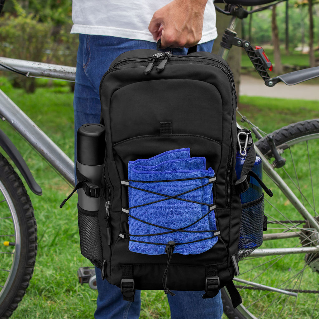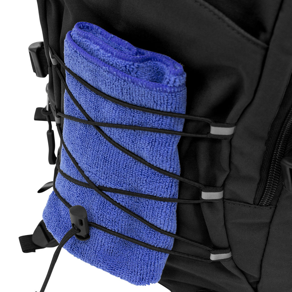 28 x 41 x 17 cm. Capacidad 19 litros. Algodón y Poliester. Mochila outdoor. Múltiples espacios para transportar objetos. Compartimento principal con bolsillo elastizado. Bolsillo frontal con cierre, cordón elástico cruzado ajustable y dos bolsillos de red laterales y cintas de amarre. Detalles reflectivos. Cierres metálicos con tiradores de goma. Correas regulables y espalda acolchadas.