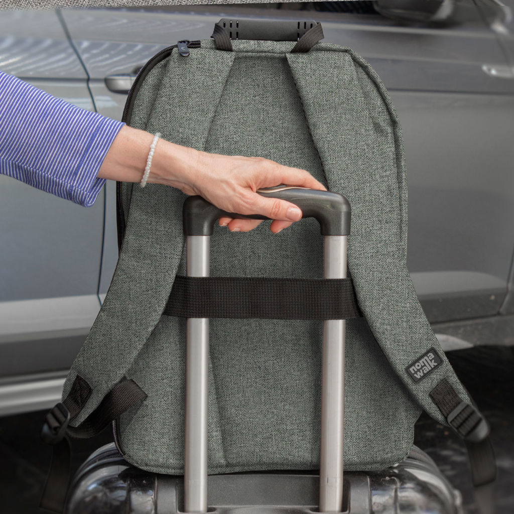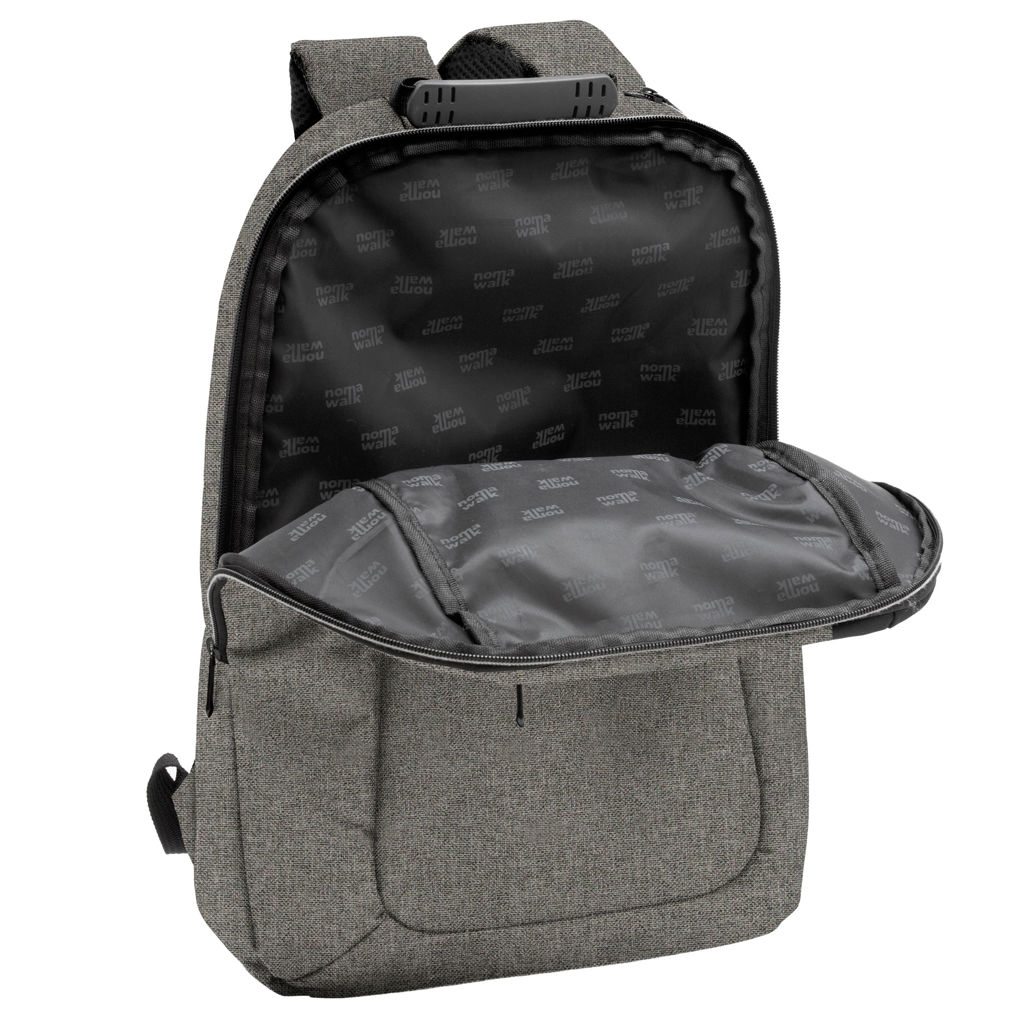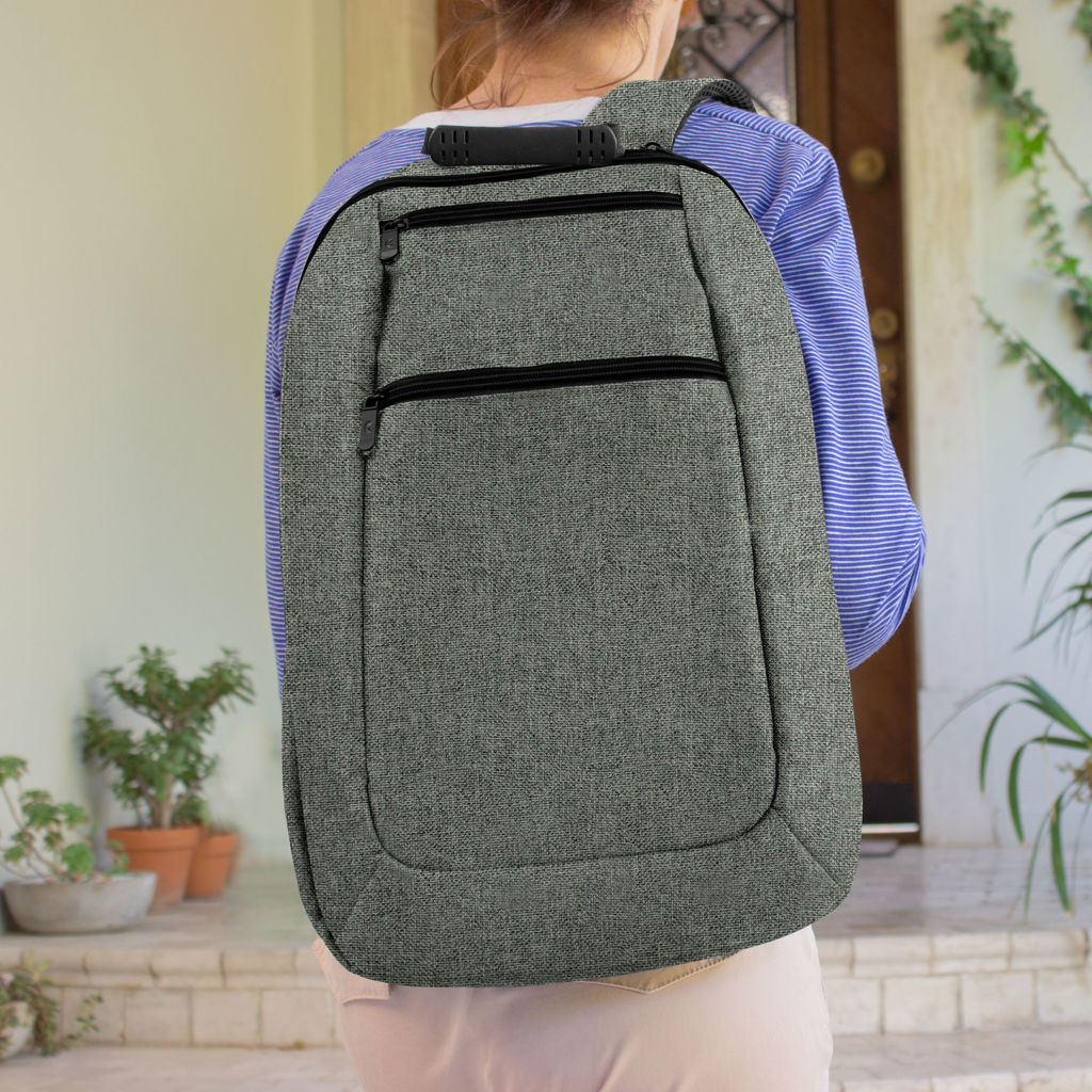 30 x 43 x 12 cm. Capacidad 14 litros. Poliéster 600D, interior poliéster 210D. Mochila portanotebook de 14 pulgadas. Compartimento lateral portanotebook, compartimento principal y 2 bolsillos frontales horizontales. Manija con refuerzo engomado, correas acolchadas, hebillas plásticas y cierres metálicos. Espalda acolchada. Tira para sujetar la mochila en la manija extensible de un equipaje de mano.