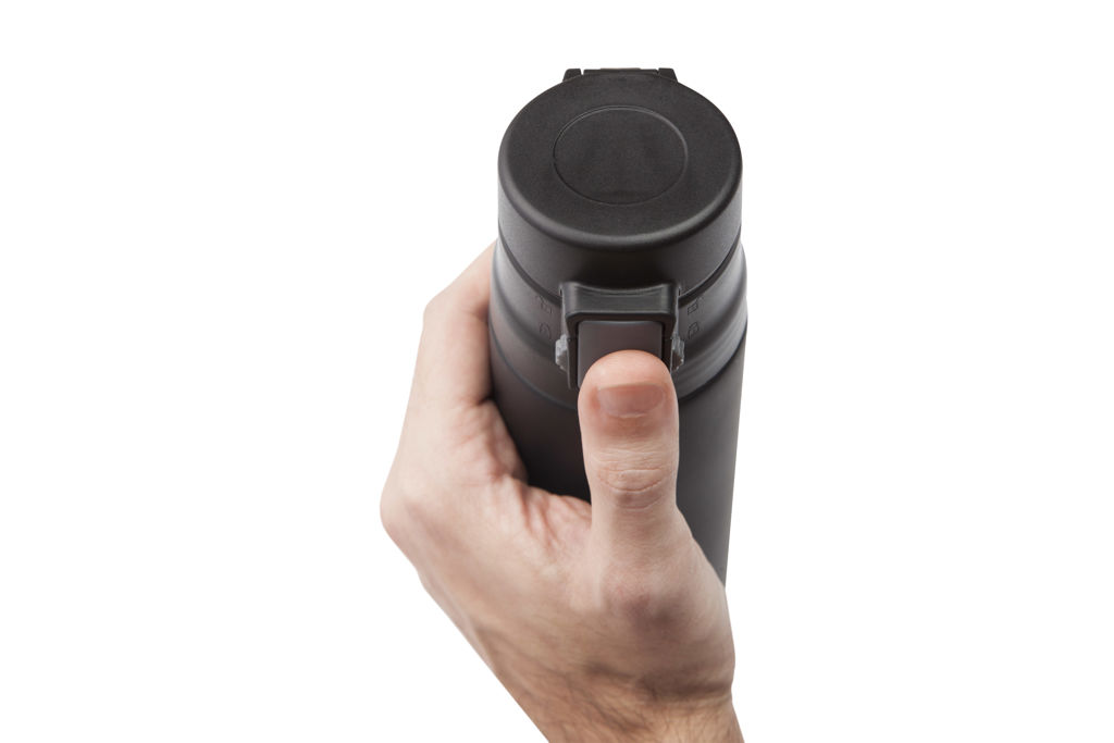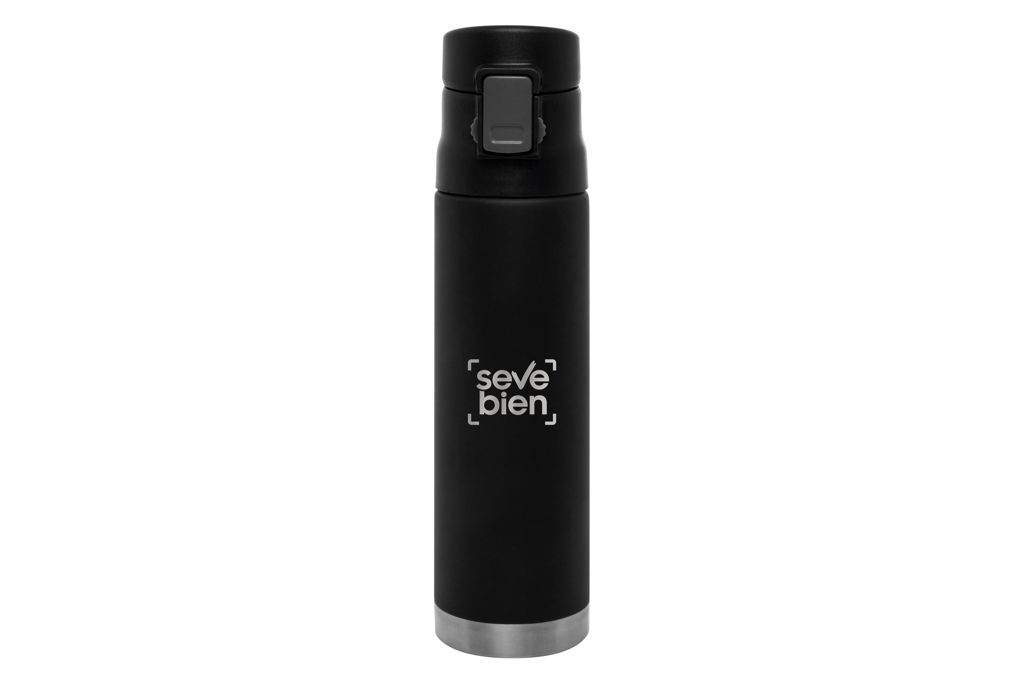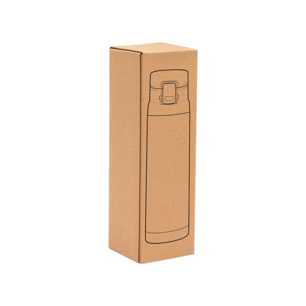 Ø 7 x 25,5 cm. Capacidad 500 ml. Acero inoxidable. Mug doble pared, sin tratamiento de vacío. Interior de acero 304 y exterior de acero 201. Tapa plástica con botón a presión de apertura. Traba de seguridad. Mantiene las bebidas frías y calientes por más tiempo. Presentación en caja de regalo.