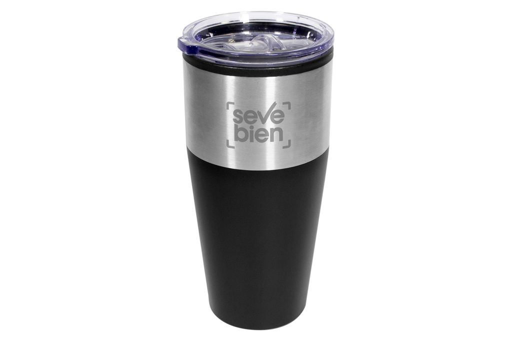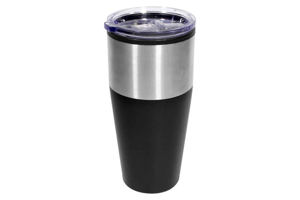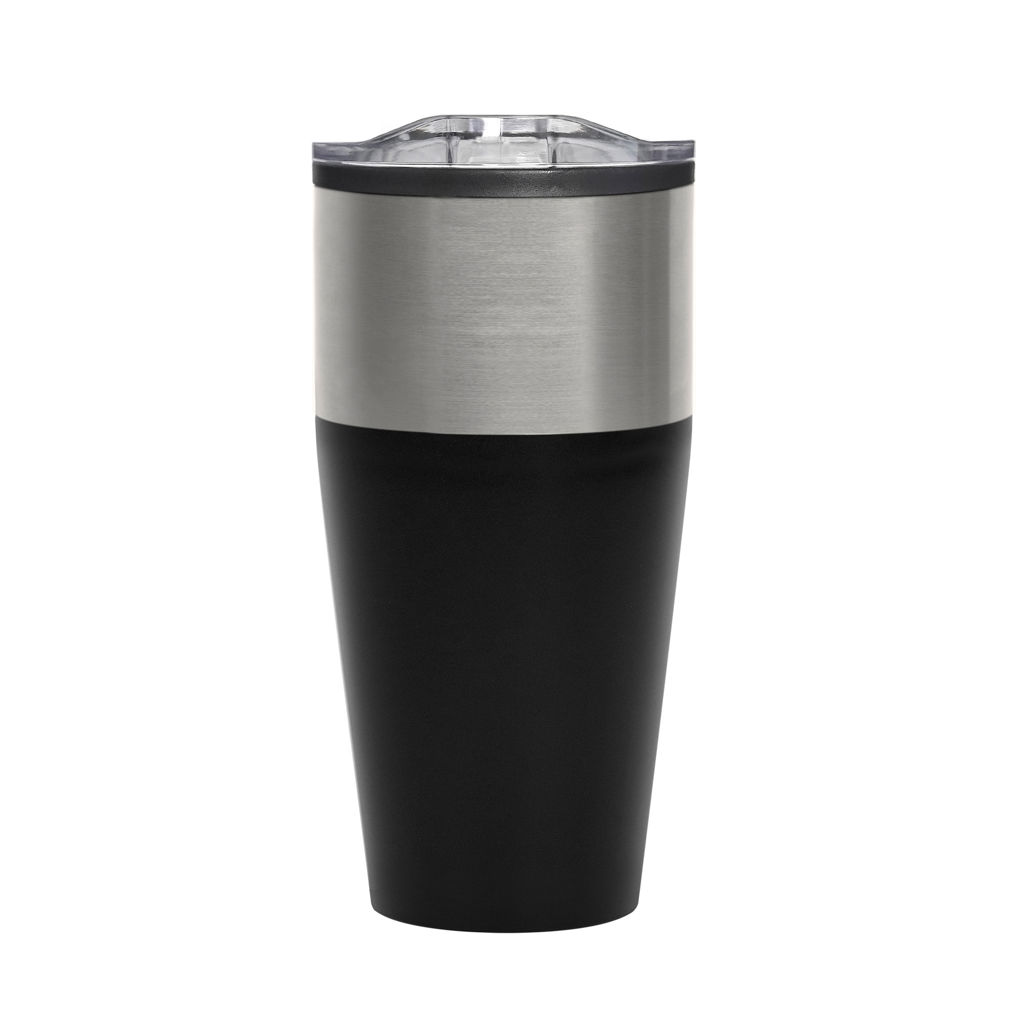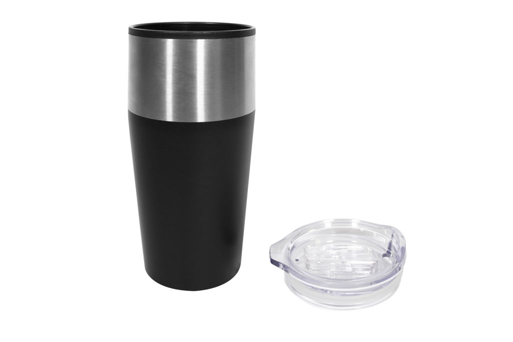 Ø 8,5 x 18 cm. Capacidad 600 ml. Plástico y acero inoxidable. Doble pared. Interior de polipropileno (PP) y exterior combinado con acero inoxidable 201. Tapa plástica transparente a presión con anillo de silicona. Presentación en caja de regalo.