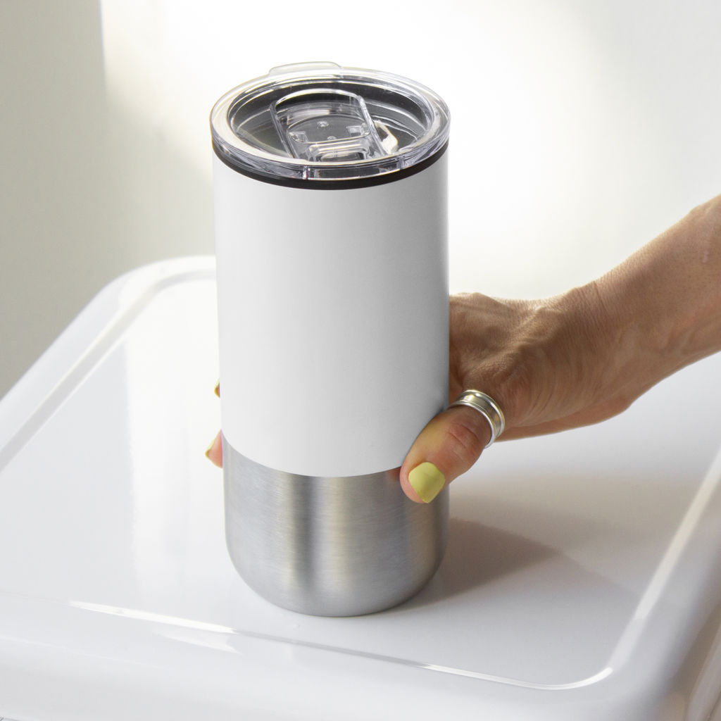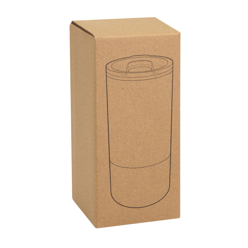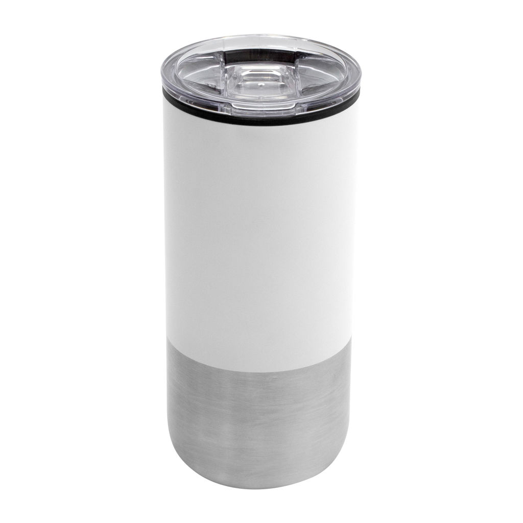 Ø 8 cm X 17.6 cm. Capacidad 500 ml. Polipropileno y acero inoxidable. Mug doble pared. Interior en plástico y exterior de acero inoxidable 201. Tapa plástica transparente a presión con anillo de silicona. Base antideslizante. Presentación en caja de regalo Kraft.