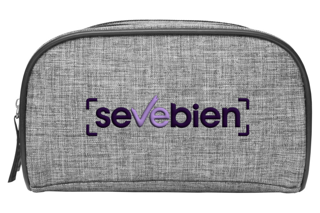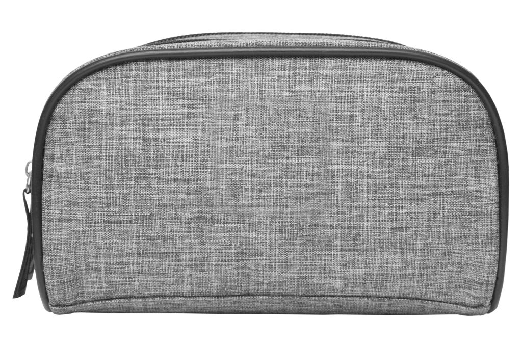 Poliéster. 19 x 10 x 9,5 cm. Necessaire con dos compartimentos, división movible sujeta con velcro. Detalles en símil cuero en ambos costados y en tiradores de cierres. Interior forrado.