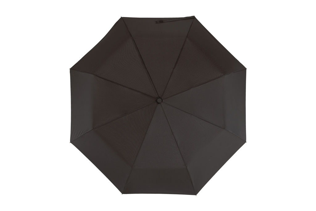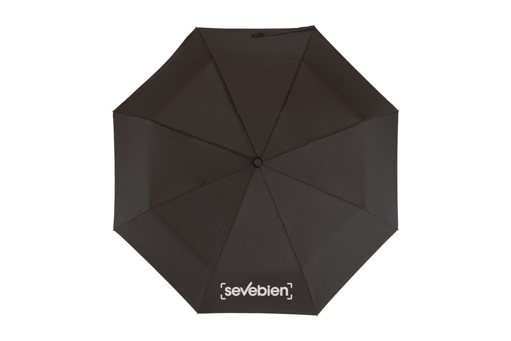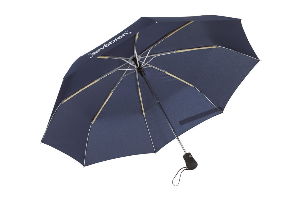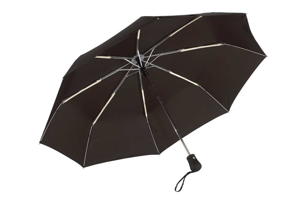 Ø 98 cm. 8 gajos. Ancho gajo 37 cm. Largo cerrado 28,5 cm. Largo abierto 55,5 cm. Poliéster Pongee con revestimiento especial hidrófugo, metal y plástico engomado. Paraguas APERTURA Y CIERRE AUTOMÁTICO. Eje y varillas metálicas. Mango de plástico engomado con correa cordón color negro. Botón a presión. Cierre con correa de velcro.