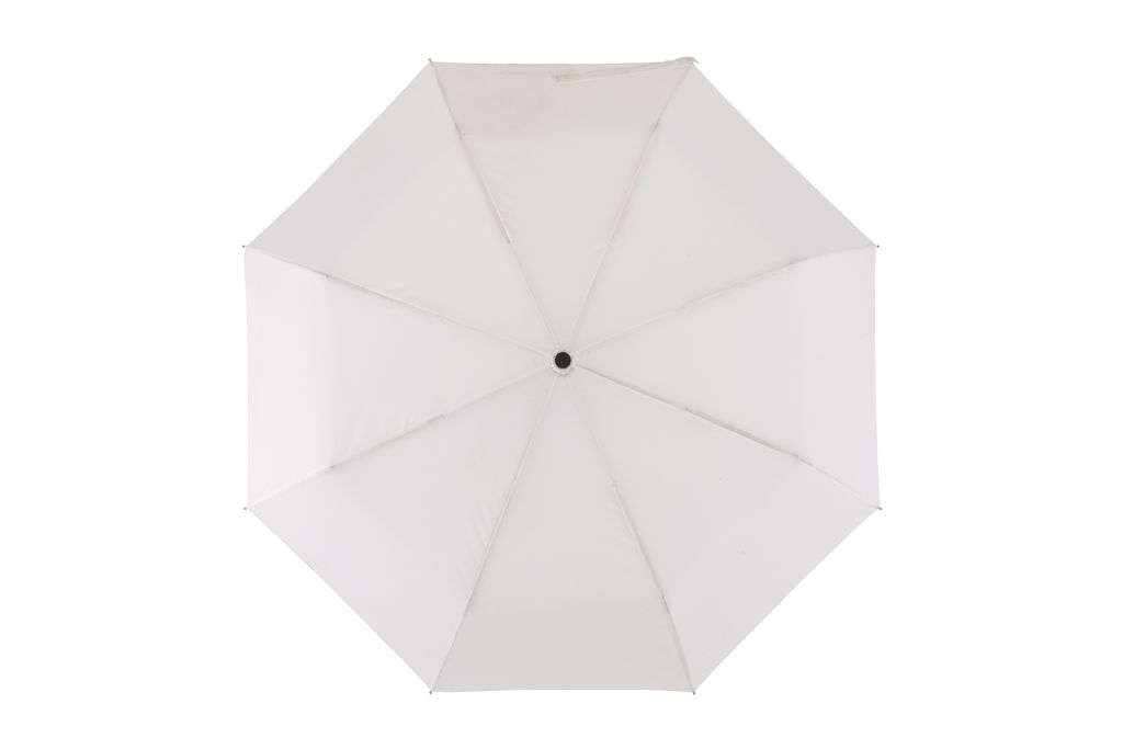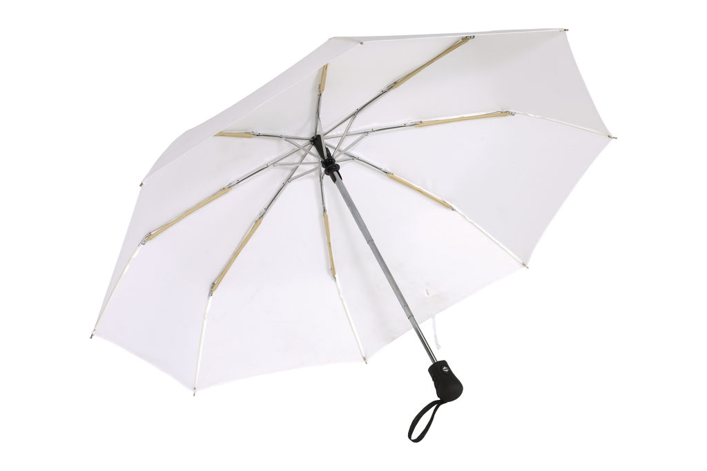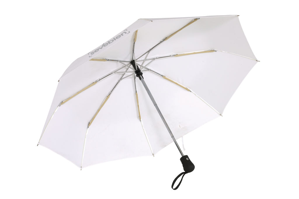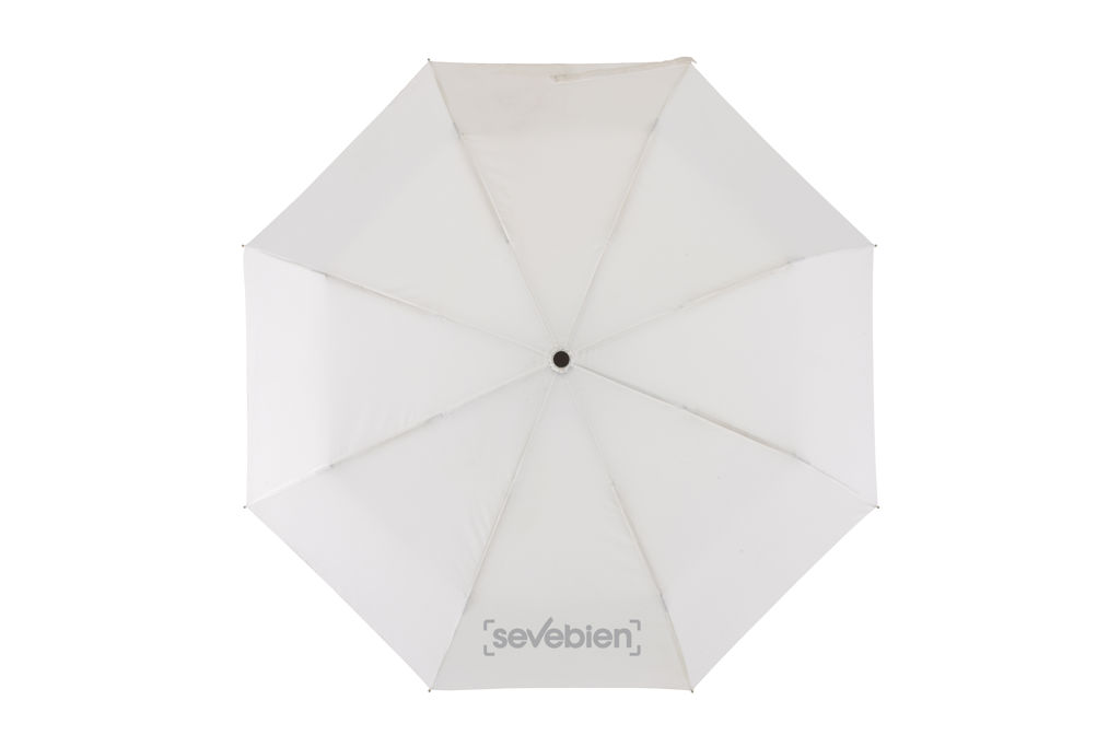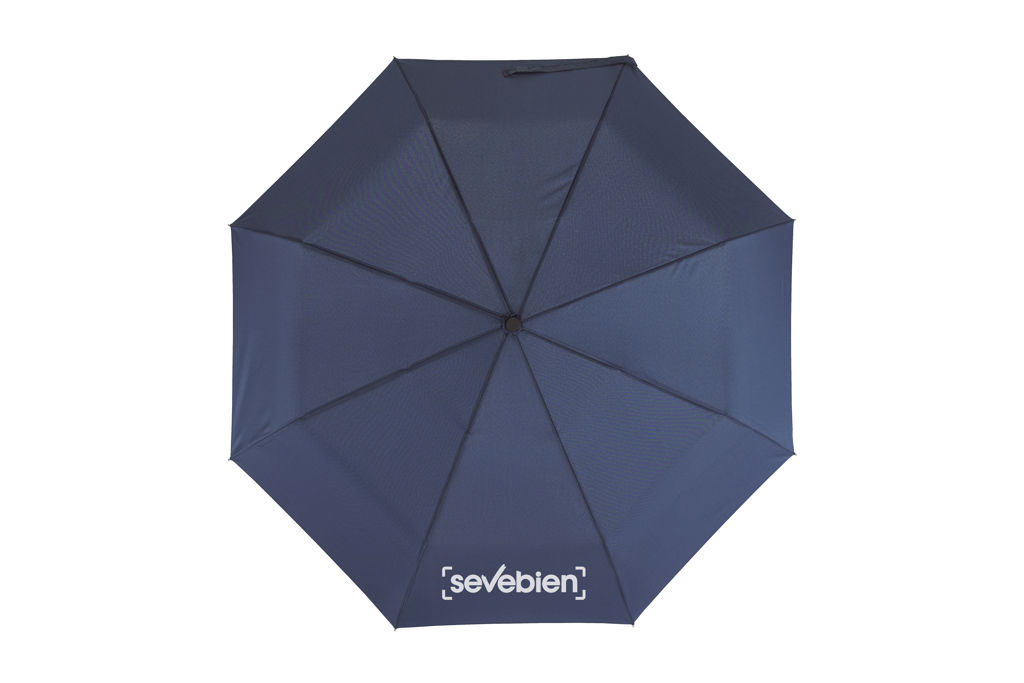 Ø 98 cm. 8 gajos. Ancho gajo 37 cm. Largo cerrado 28,5 cm. Largo abierto 55,5 cm. Poliéster Pongee con revestimiento especial hidrófugo, metal y plástico engomado. Paraguas APERTURA Y CIERRE AUTOMÁTICO. Eje y varillas metálicas. Mango de plástico engomado con correa cordón color negro. Botón a presión. Cierre con correa de velcro.