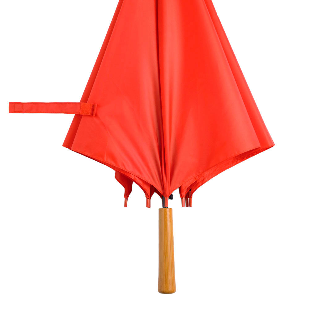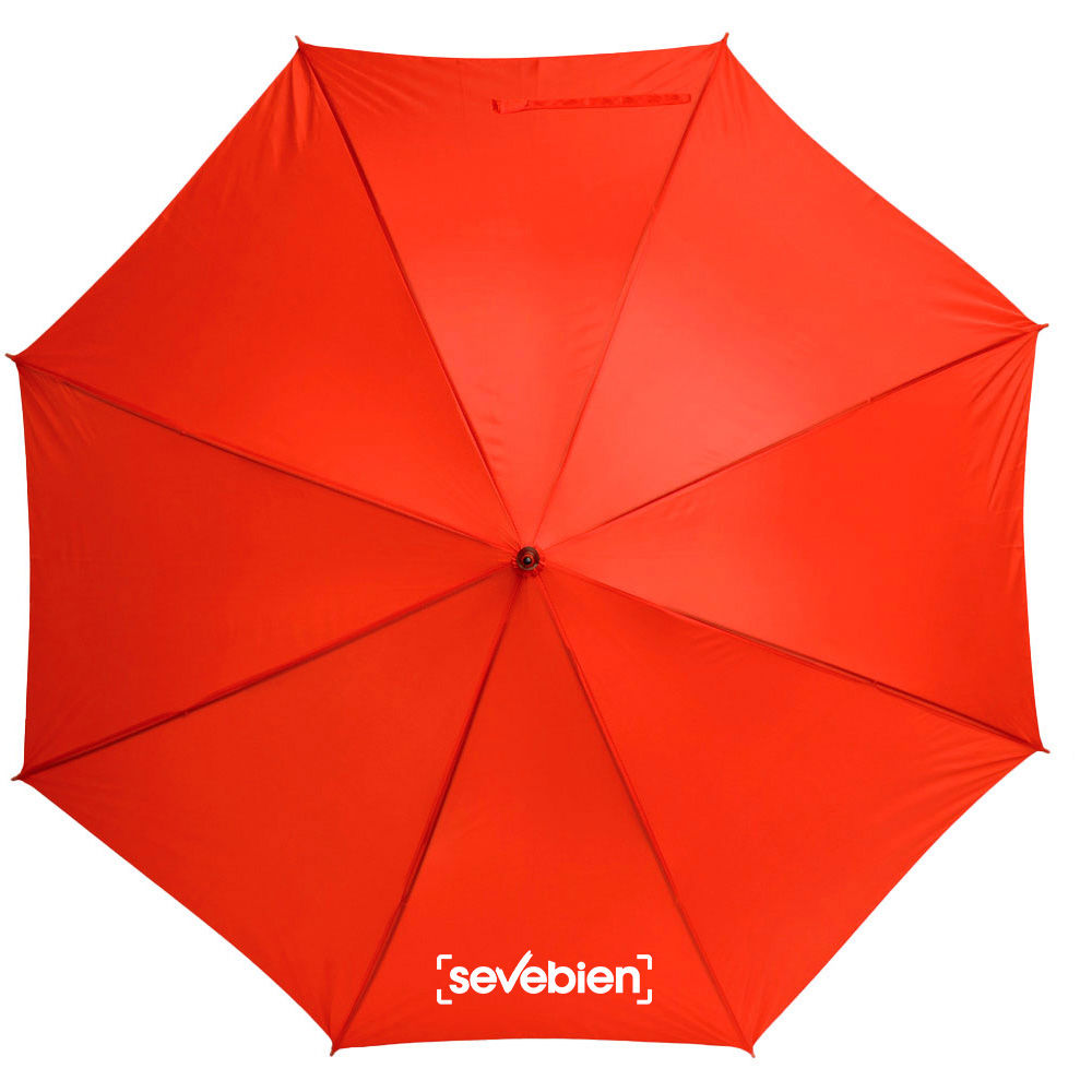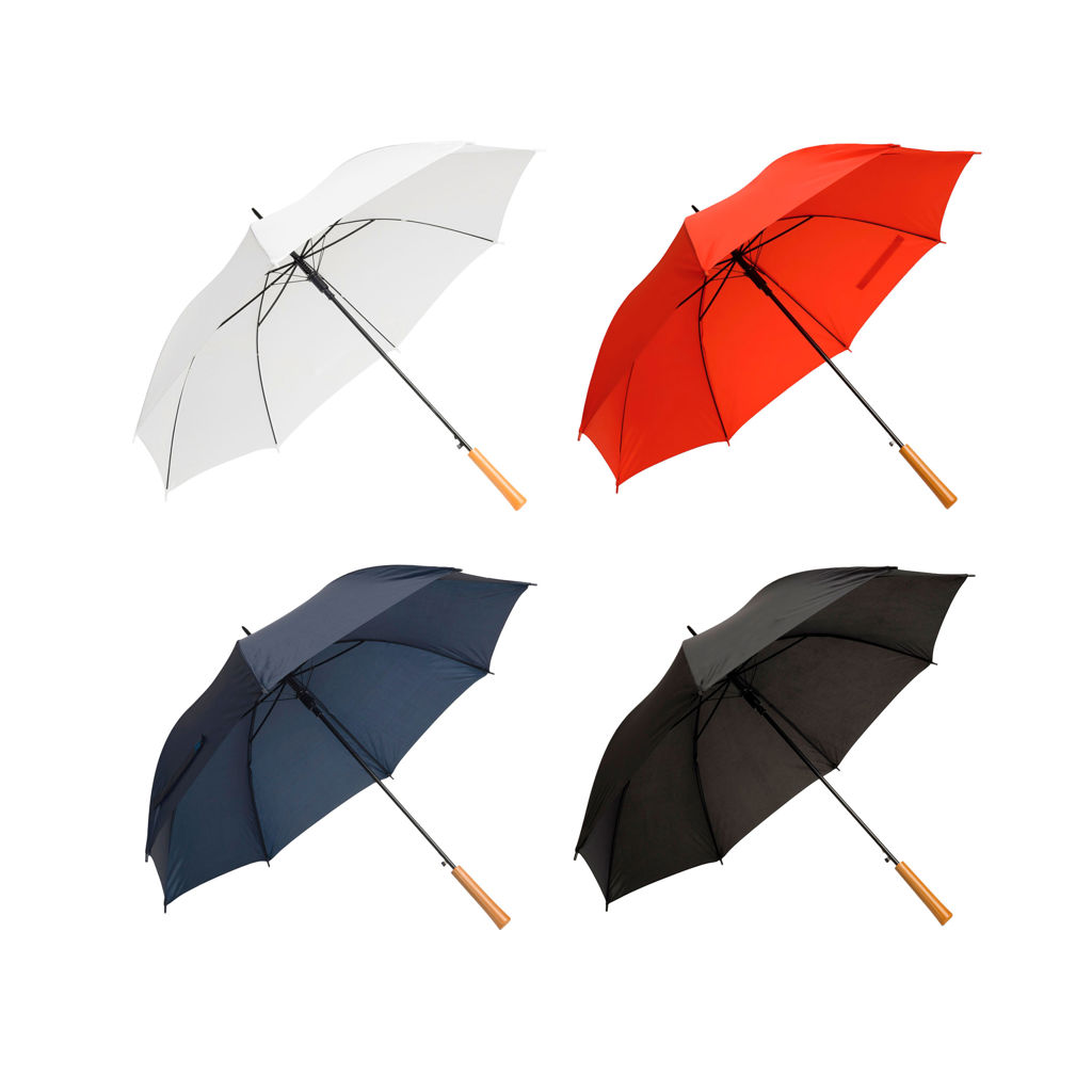 Ø 100 cm. 8 gajos. Ancho gajo 40 cm. Largo total 84 cm. Poliéster, metal y PVC. Paraguas APERTURA AUTOMÁTICA Y CIERRE MANUAL. Eje, varillas y punta metálicas y mango en PVC, símil madera. Botón a presión. Cierre con correa de velcro.