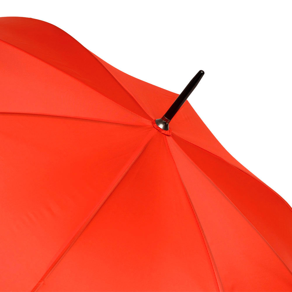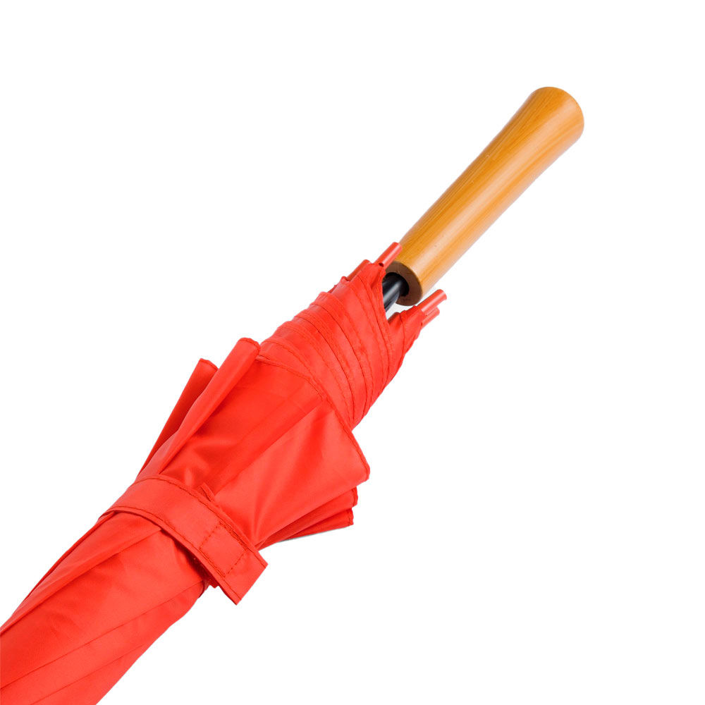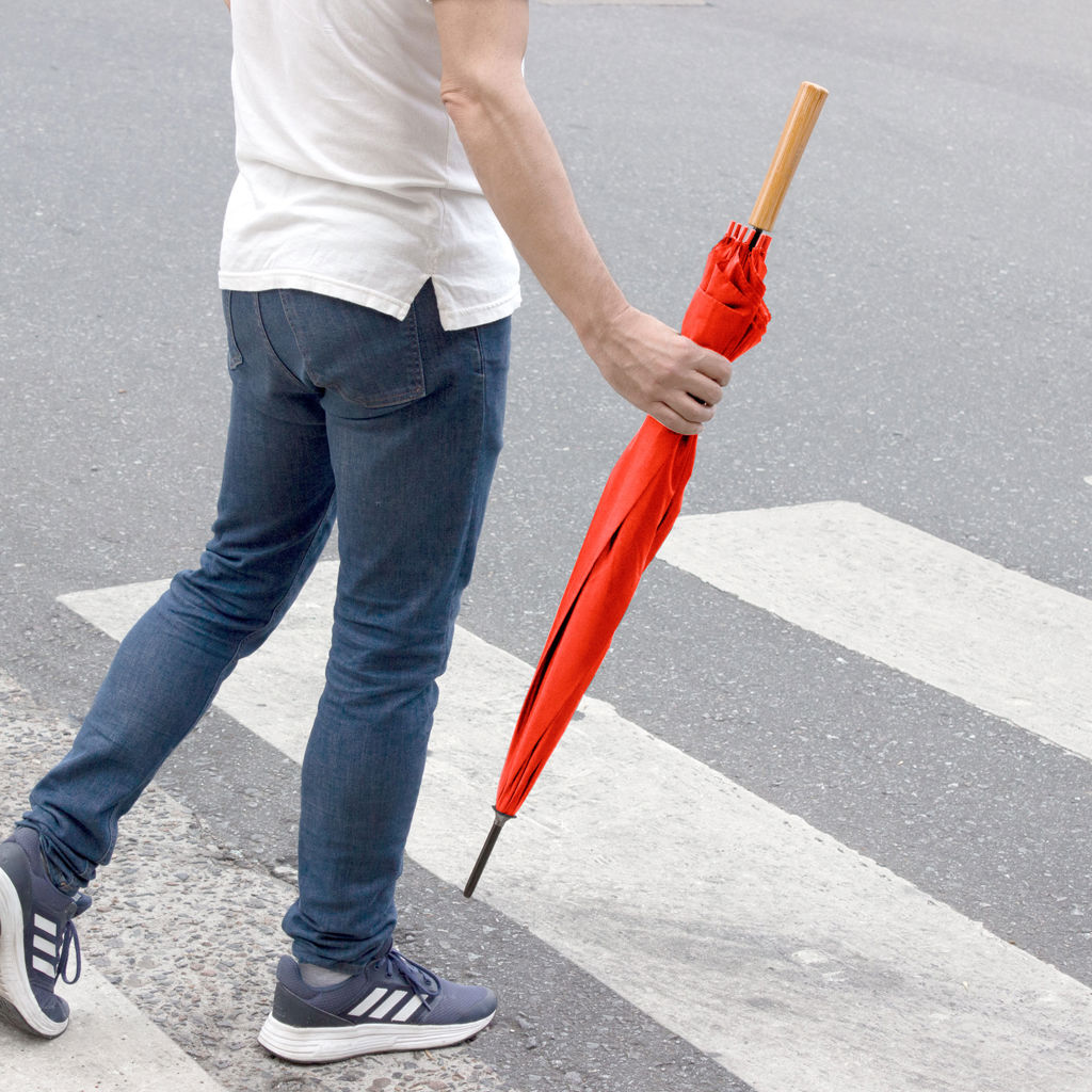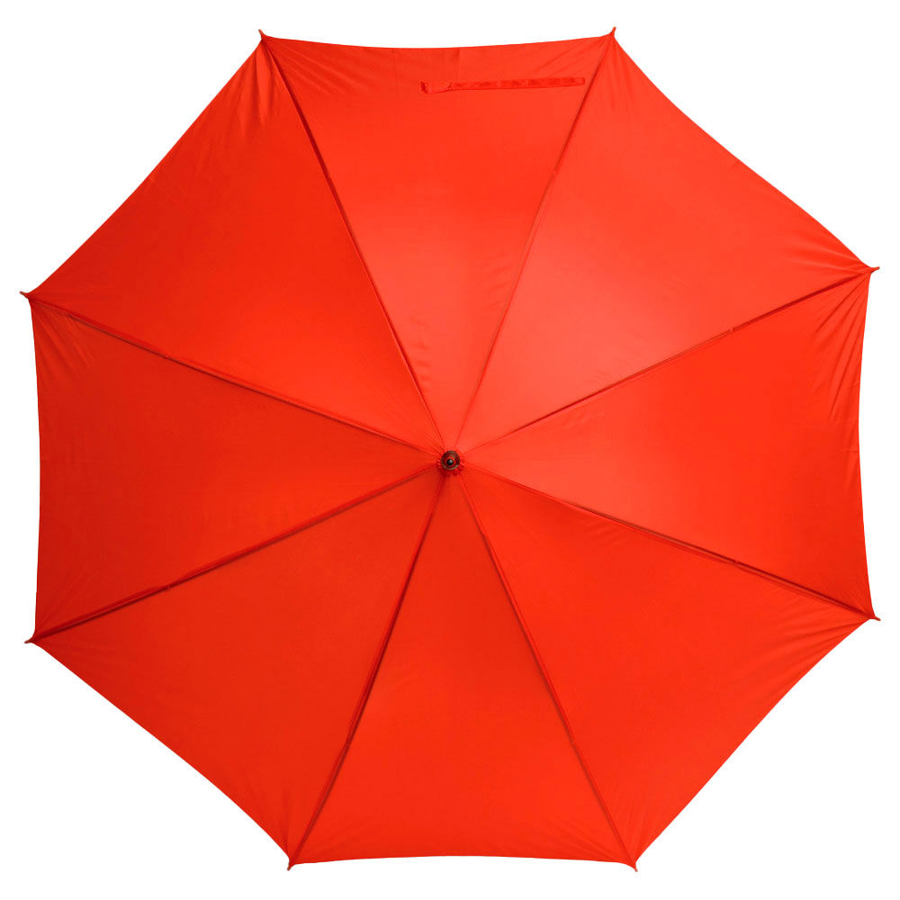 Ø 100 cm. 8 gajos. Ancho gajo 40 cm. Largo total 84 cm. Poliéster, metal y PVC. Paraguas APERTURA AUTOMÁTICA Y CIERRE MANUAL. Eje, varillas y punta metálicas y mango en PVC, símil madera. Botón a presión. Cierre con correa de velcro.