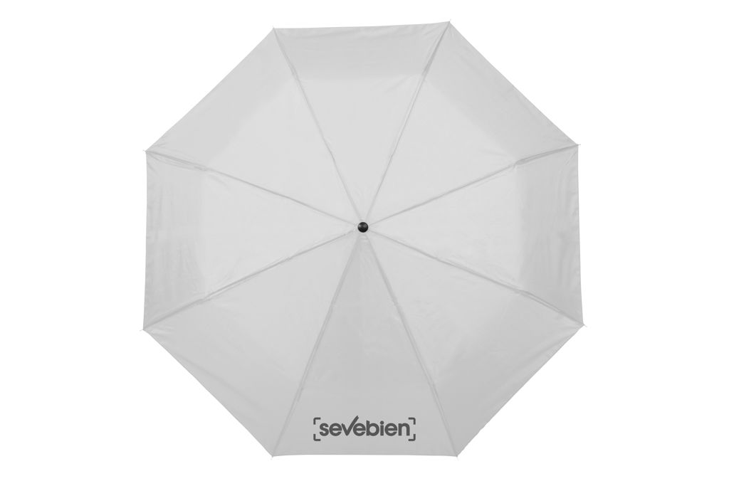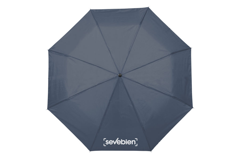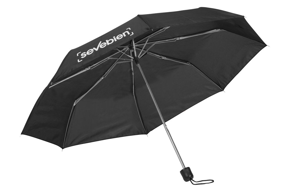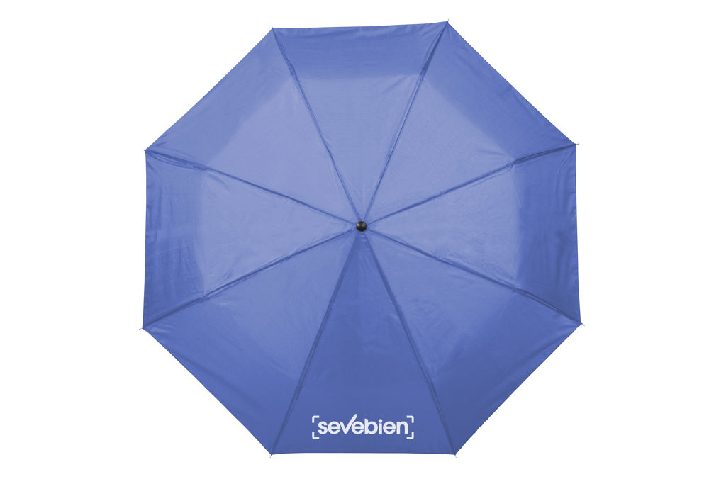 Ø 98 cm. 8 gajos. Ancho gajo 37 cm. Largo cerrado 24 cm. Largo abierto 54 cm. Poliéster, metal y plástico. Paraguas APERTURA Y CIERRE MANUAL. Eje y varillas metálicas. Mango de plástico negro con correa cordón color negro. Cierre con correa de velcro.