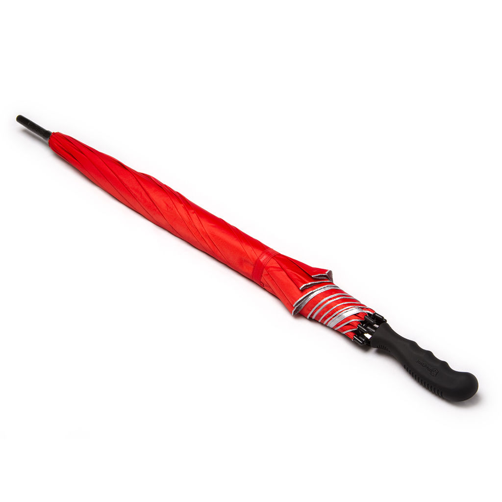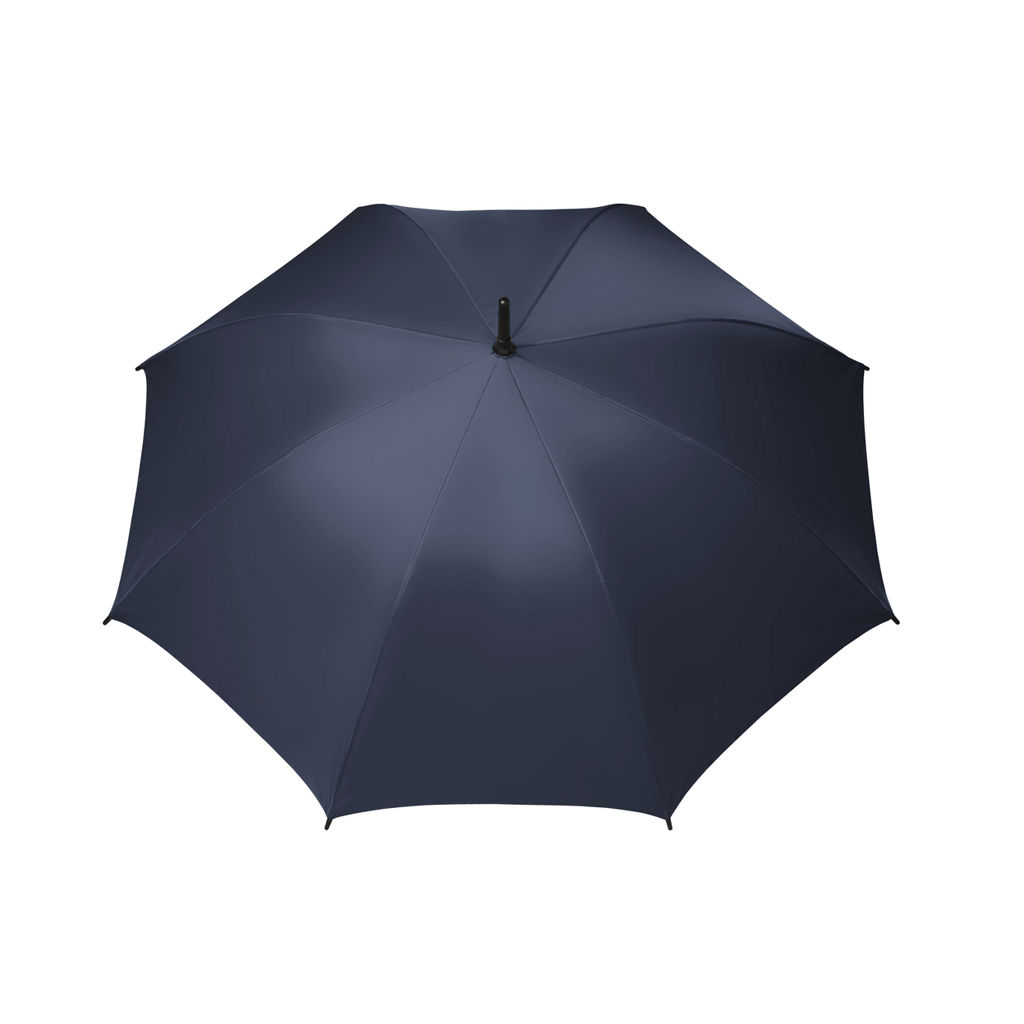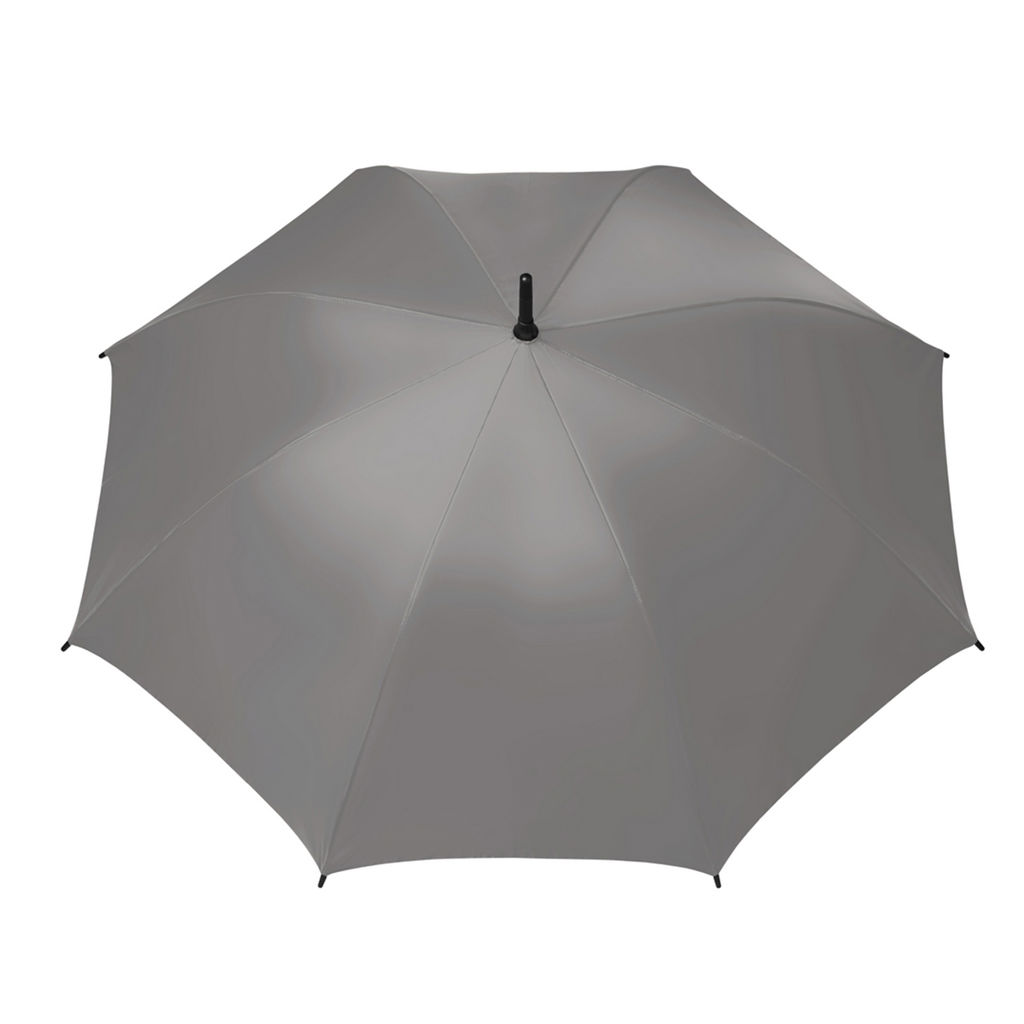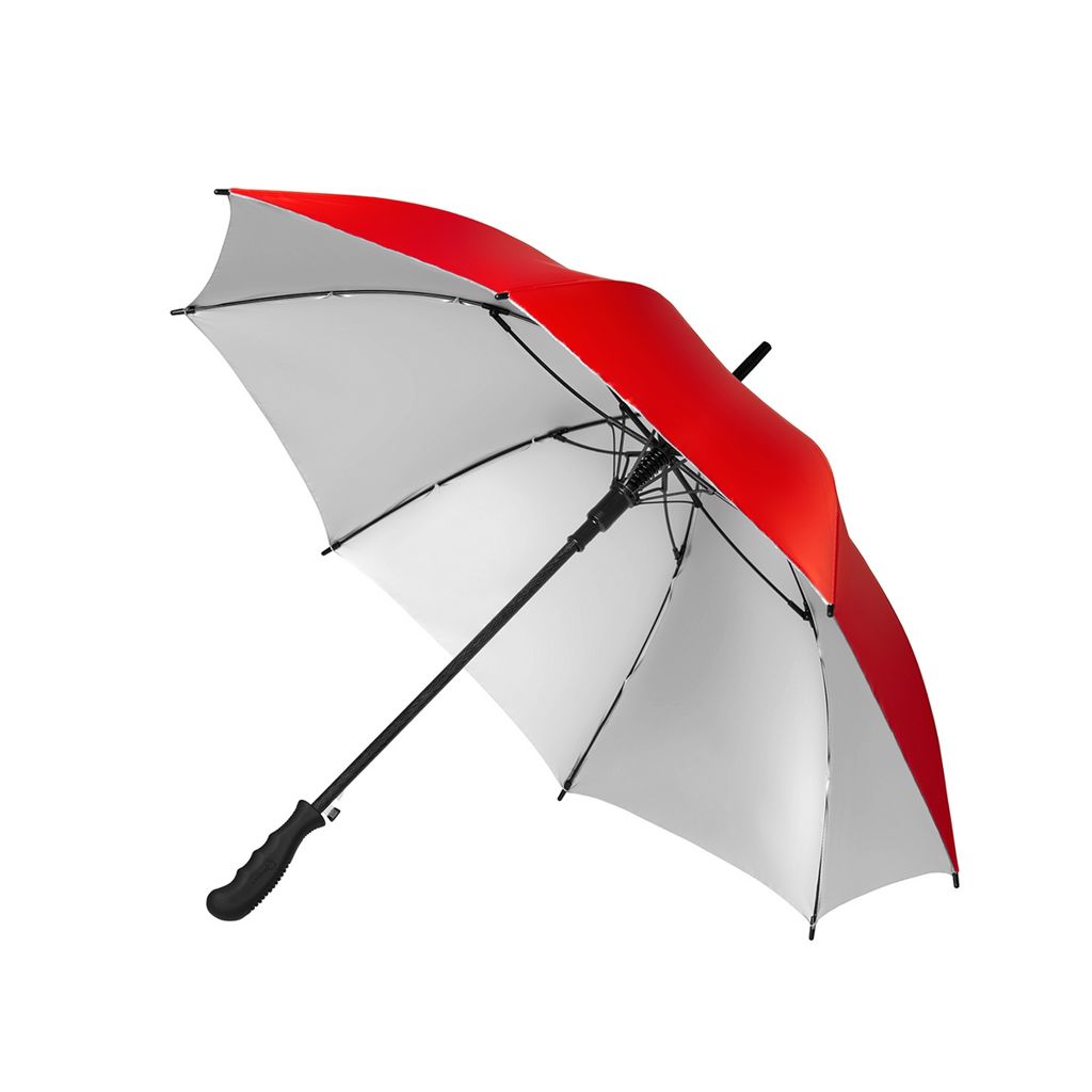 Paraguas confeccionado en Pongee 190T de alta resistencia, impermeabilidad y calidad. Posee un robusto marco de 8 varillas de apertura automática, realizado con un material exclusivo que combina fibra de vidrio y plástico super ligero que le brinda durabilidad y no atrae rayos. Mango de plástico cubierto con una goma, de diseño anatómico para un agarre cómodo y no deslizante en condiciones de húmedad. Medidas: Largo. 83 cm x diámetro 105 cm.