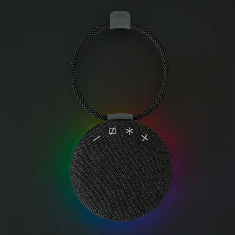 El parlante Fullmoon cuenta con luces led multicolor y una correa ajustable para que lo lleves a donde quieras. Está fabricado en ABS y silicona, con un recubrimiento de tela.