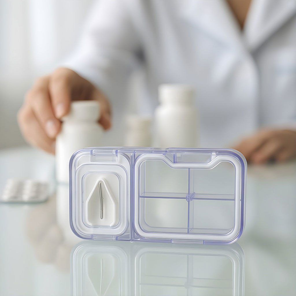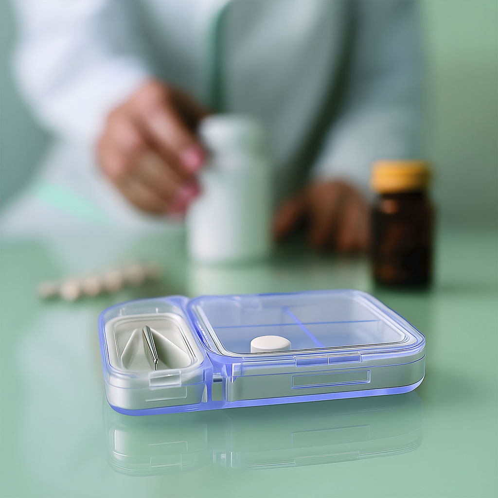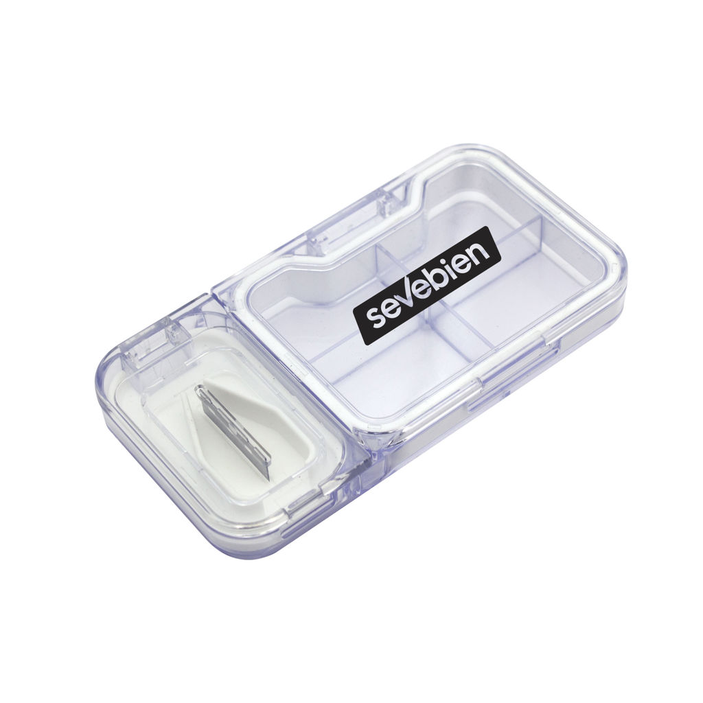 Compacto, práctico y seguro.Pastillero organizador corta pastilla. Compartimento principal con cuatro divisiones y recubrimiento perimetral de silicona. Compartimento secundario con base de silicona y soporte regulable de pastillas. Cuchilla de acero incorporada en la tapa. Ambos compartimentos con tapa rebatible y cierre a presión.Medidas: 12 x 6,3 x 1,8 cm