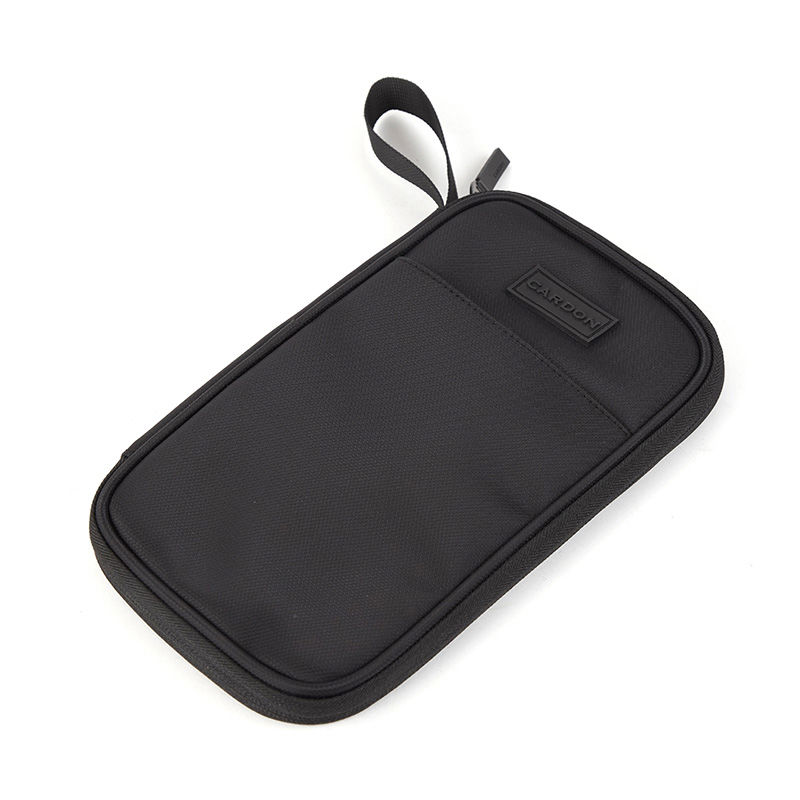 Porta pasaporte confeccionado en Polyester con cierre en tono en todo su contorno y cabezal metálico color negro. Interior con 13 espacios ideal para tarjetas o credenciales, más 3 solapas para documentación varia (dos de ellas con red) y, un bolsillo del largo total con cierre independiente ideal para guardado de dinero o documentación importante. Cuenta con un espacio para guardar un bolígrafo. Bolsillo externo frontal sin cierre y correa de 10 cm para facilitar el agarre. Dimensiones: 26 x 13 x 2,5 cm (Alto x Longitud x Ancho). Cardon.