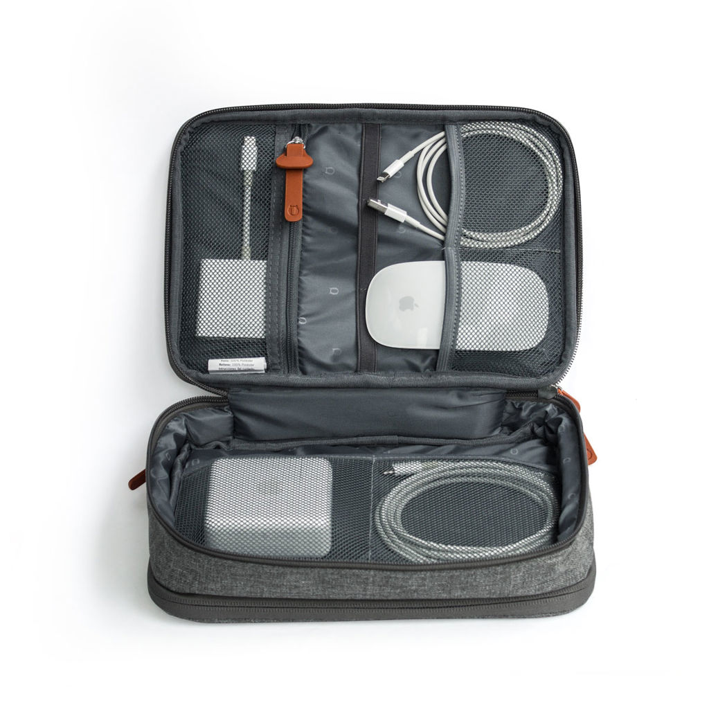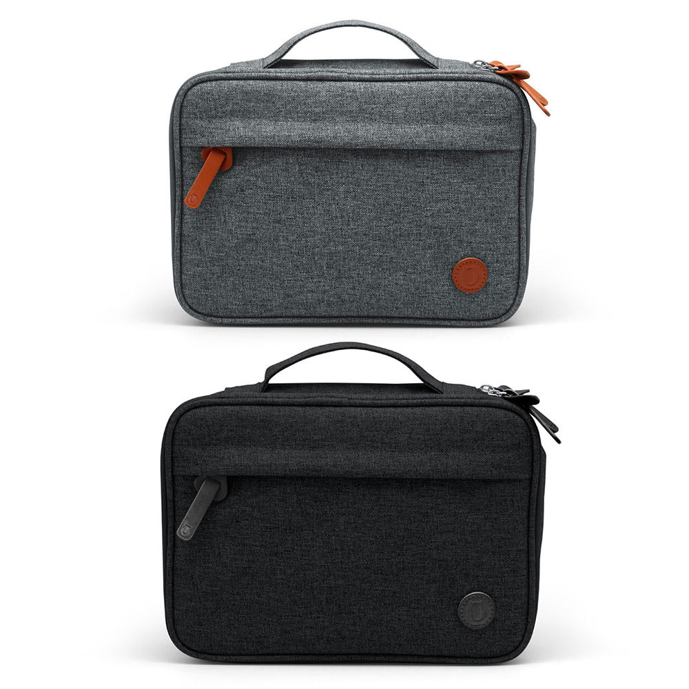 26 x 19,1 x 5,6 cm. Poliéster, Nylon y Cuero ecológico. U TECH. Práctico portacables y porta accesorios con dos compartimentos acolchados individuales y divisiones internas. Cuenta con un bolsillo delantero, espacio para guardar tablet y manija de agarre para transportar.