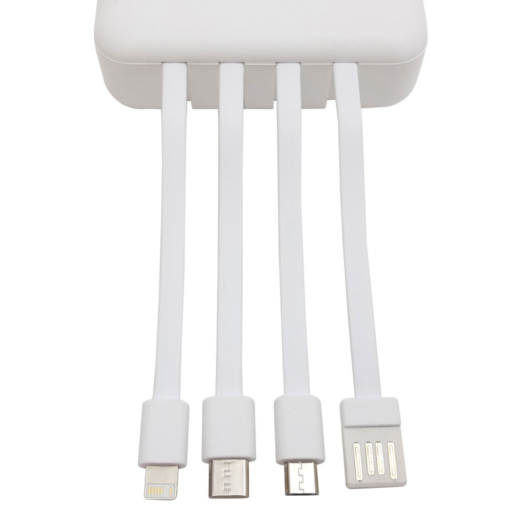 8,8 x 7,9 x 2,6 cm. Capacidad: 5000 mAh. Plástico ABS acabado mate. Power bank multipuerto. Pantalla digital. Doble salida USB. Entradas micro-USB y USB tipo C. Salida de carga rápida 2A. Linterna dual led. 4 cables de carga integrados: USB, Micro USB, Tipo C y IPhone. Puede cargar hasta 5 dispositivos al mismo tiempo. Presentación en caja de regalo.