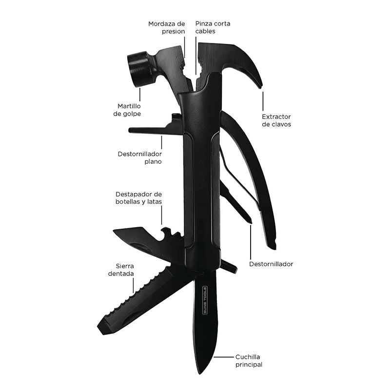 Martillo multifuncional con elementos de acero inoxidable y aluminio de 6 funciones. Incluye estuche negro. Medidas:19,3 x 20,5 x 3,8 cm. Suns Tools.