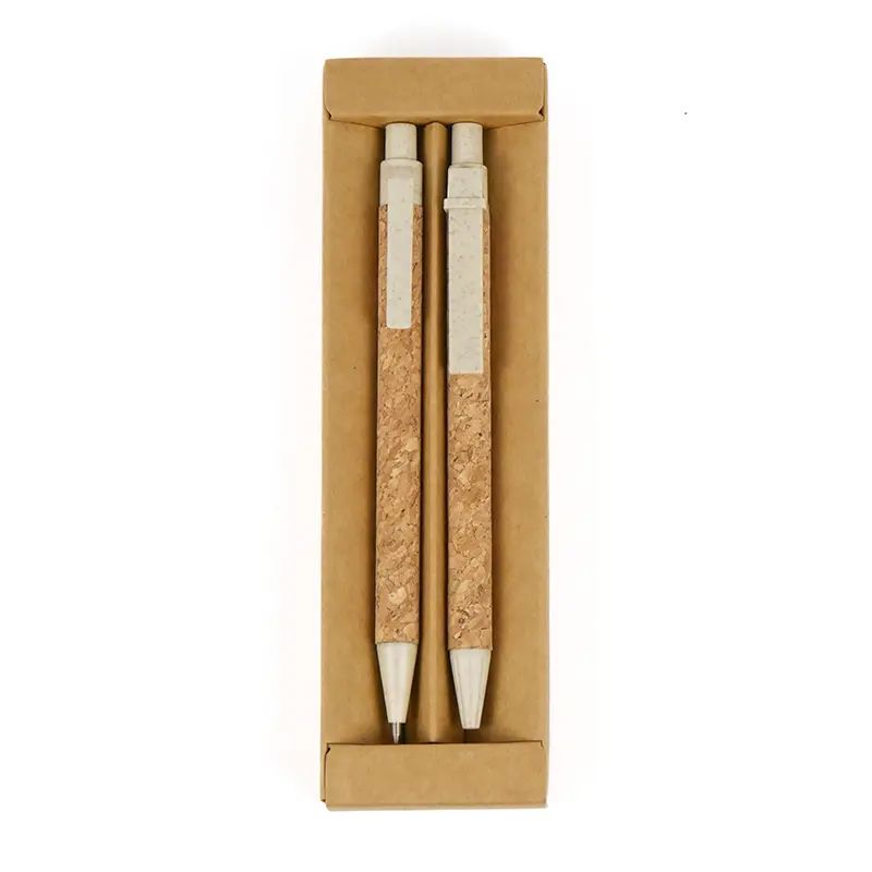 El Set Ancor incluye bolígrafo y lápiz con cuerpo de corcho y piezas de Wheat Straw, pasta de tallo de trigo, un material sustentable que reduce el consumo de plásticos vírgenes. Viene presentado en una práctica caja de cartón.