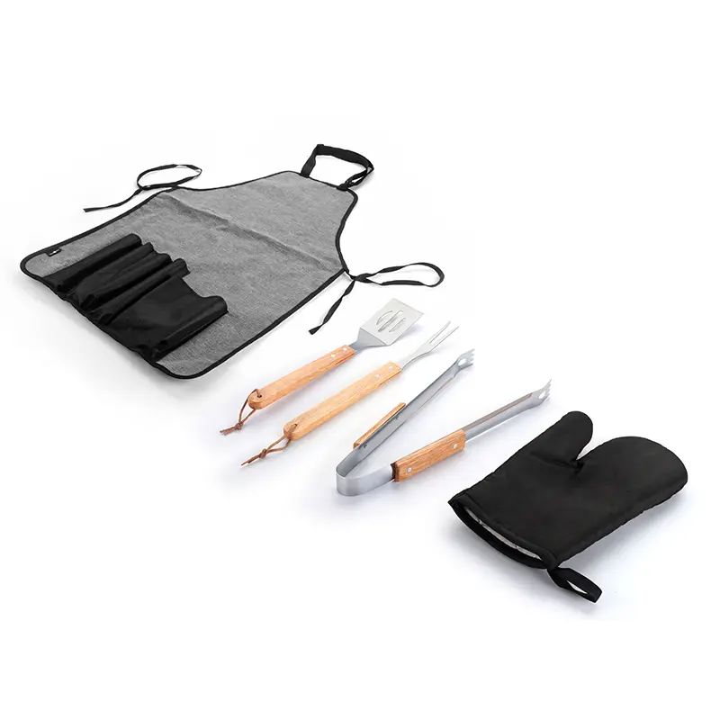 Set parrillero con delantal, espátula, tenedor, pinza y guante. El delantal de policanvas cuenta con compartimientos para guardar los utensilios fabricados en acero inoxidable 420, madera y poliéster. Incluye espátula de 36 cm, tenedor de 35 cm, pinza de 36 cm y un guante resistente al calor. Ideal para hacer asados cómodamente, con todo ordenado y fácil de llevar para las parrilladas y juntas al aire libre.