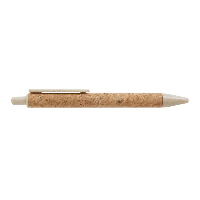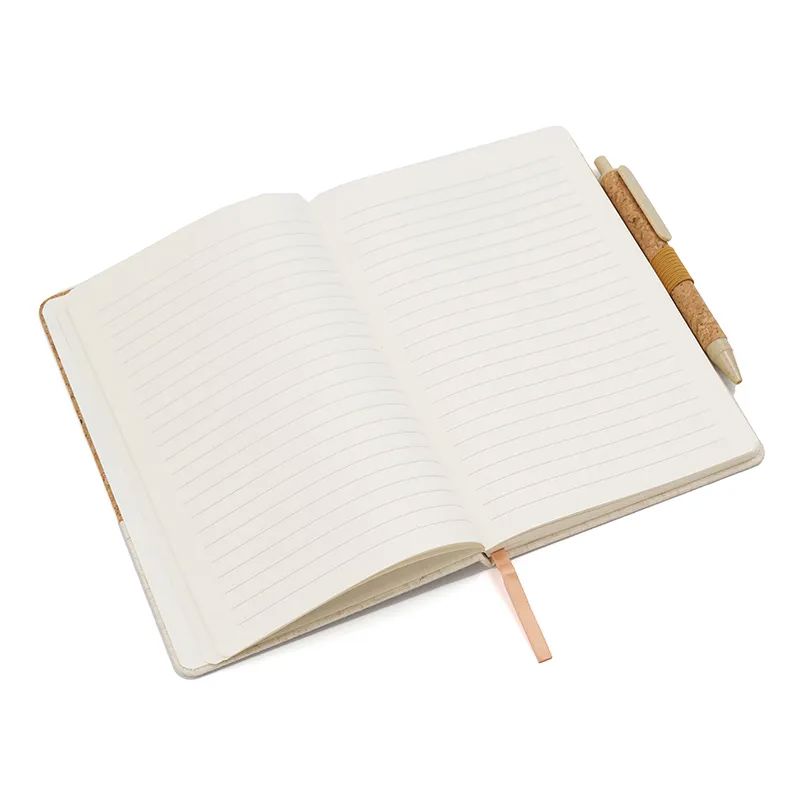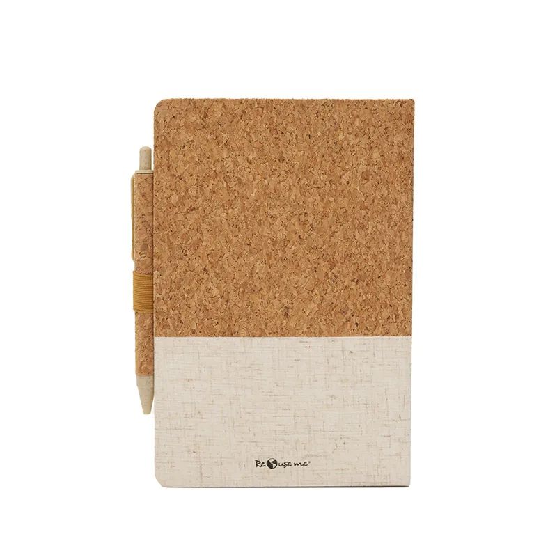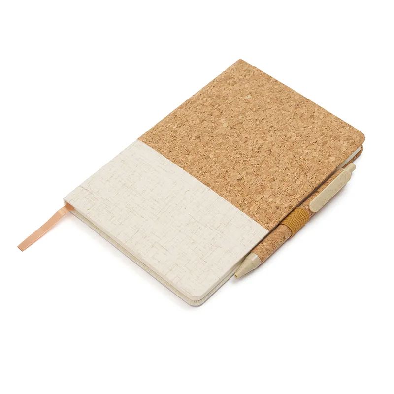 Cuaderno A5 de tapa dura hecho de corcho natural y tela ecológica. Fabricado con materiales sostenibles como corcho, algodón y papel reciclado, cuenta con marcador de cinta, soporte para bolígrafo y bolígrafo incluido con cuerpo de papel envuelto en corcho y detalles en fibra de trigo. Es ideal para tomar notas en reuniones, estudios, planificación diaria o como regalo corporativo con conciencia ecológica.