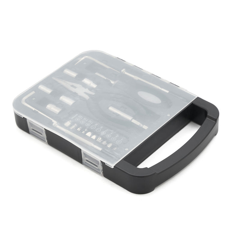 Set de herramientas, con en maletin de tapa transparente. Incluye: pinza, 2 llaves allen, destornillador de puntas intercambiables y 2 mini destornilladores Medidas: 22 x 16 x 2,7 cm. Tahg