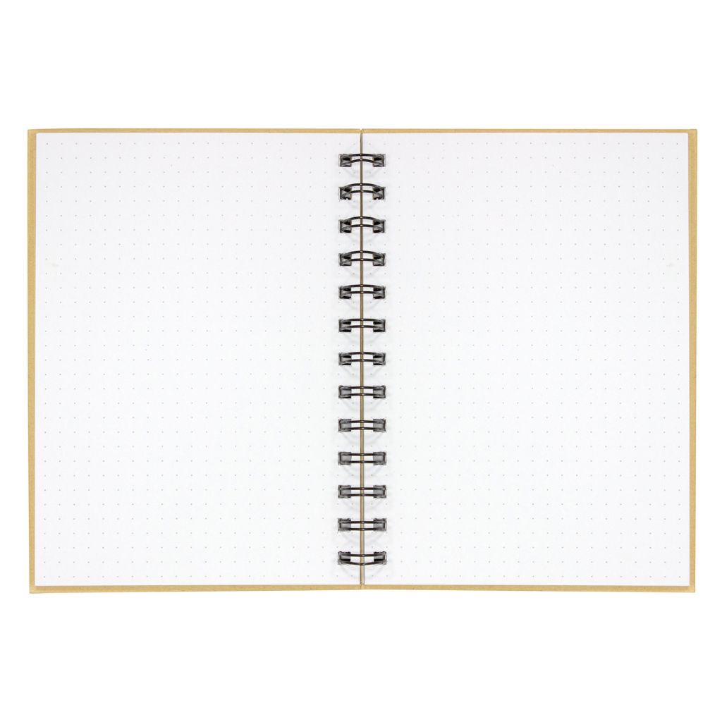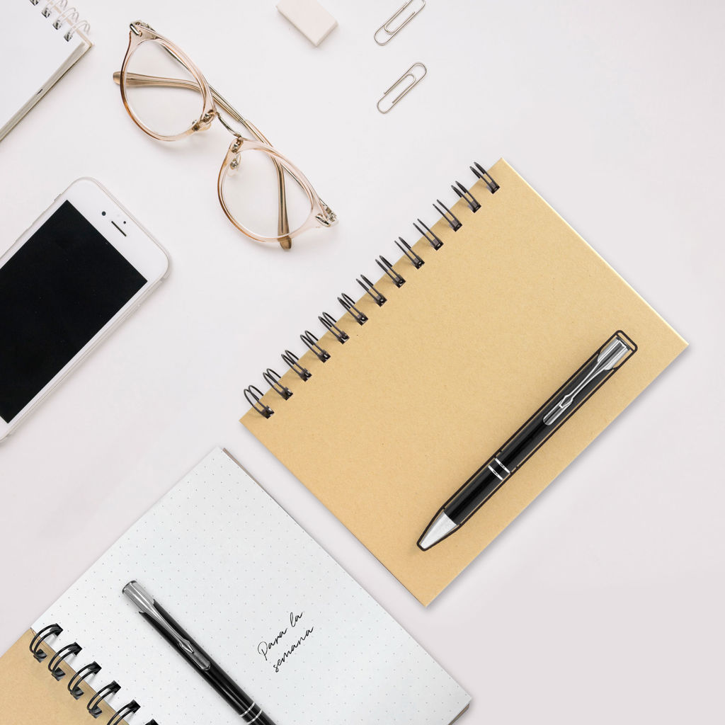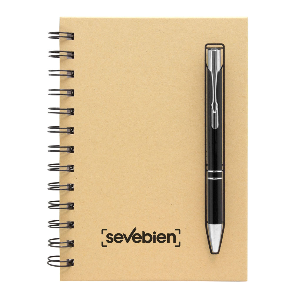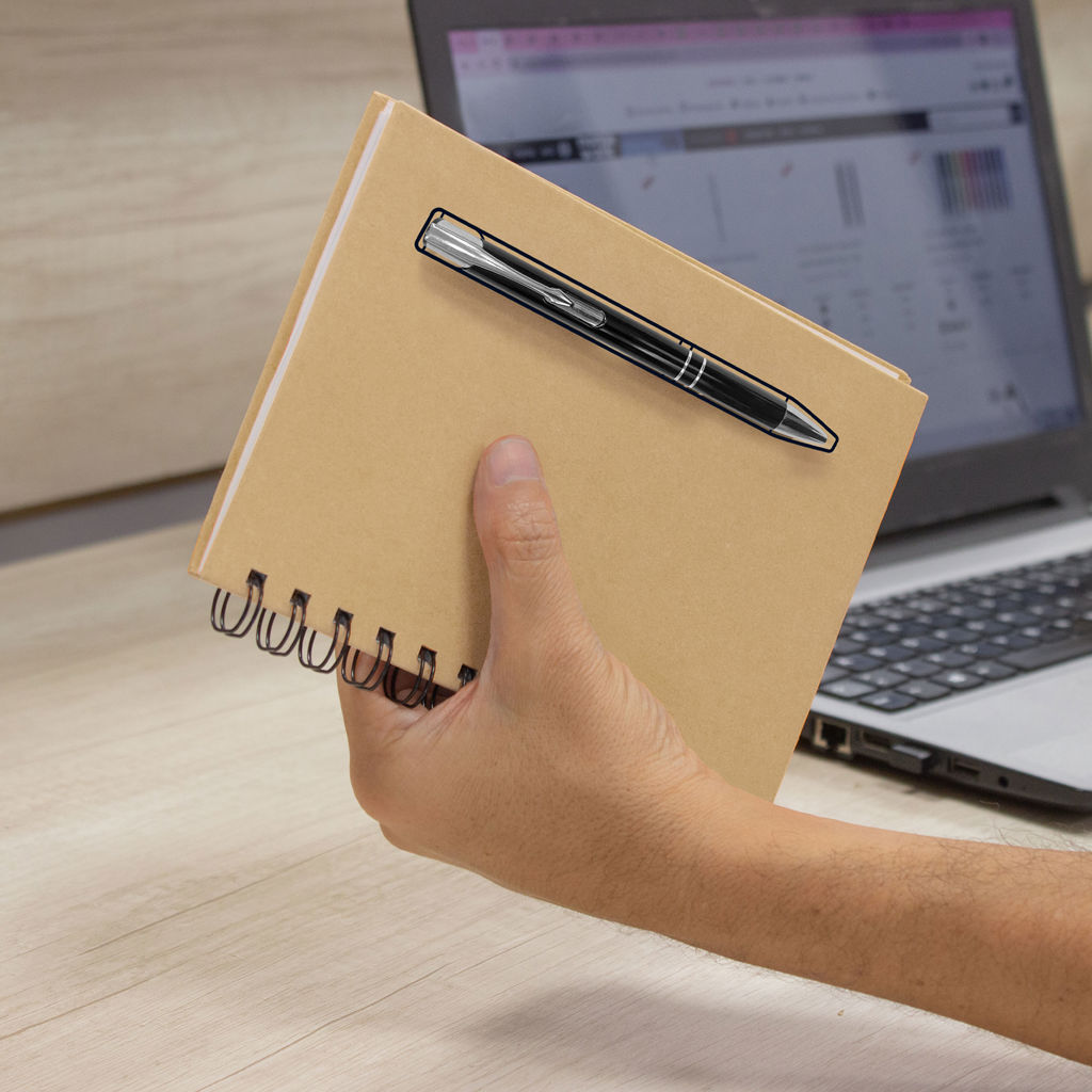 13 x 18 cm. Libreta color Kraft, anillado metálico y 70 hojas punteadas de 70g. Bolígrafo metálico (BP295) color negro con tinta negra. Mediante sistema de imanes el bolígrafo queda sujetado a la tapa, causando un efecto sorprendente.