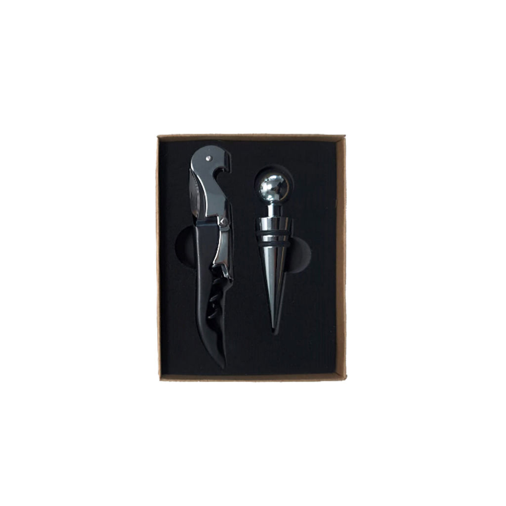 13 x 10 x 2,5 cm. Metal. Accesorios para vinos. Sacacorcho y tapón en metal. Estuche de cartón. Presentación en caja de regalo.