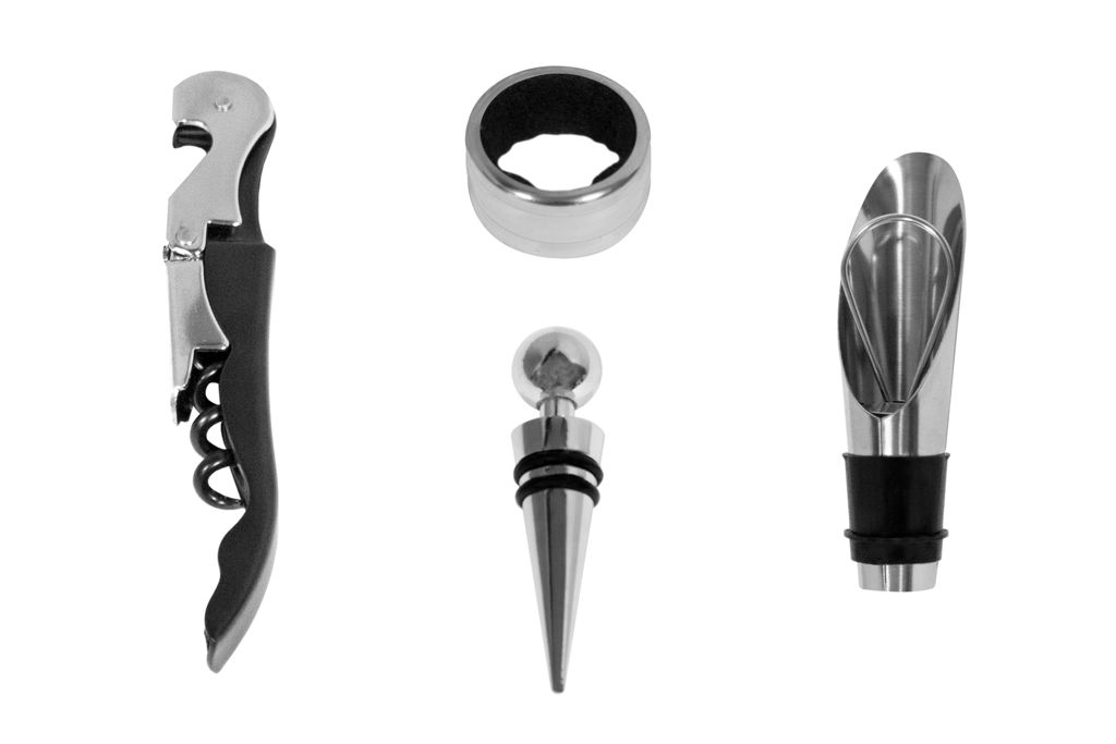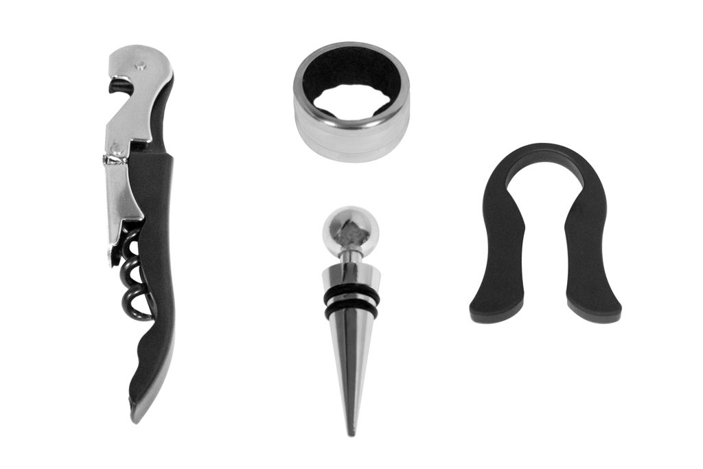 16 x 14 x 5 cm. Simil cuero. Accesorios para vino en estuche de simil cuero. Cuenta con sacacorcho, anillo antigoteo, tapón y corta cápsula. Presentación en caja de regalo.