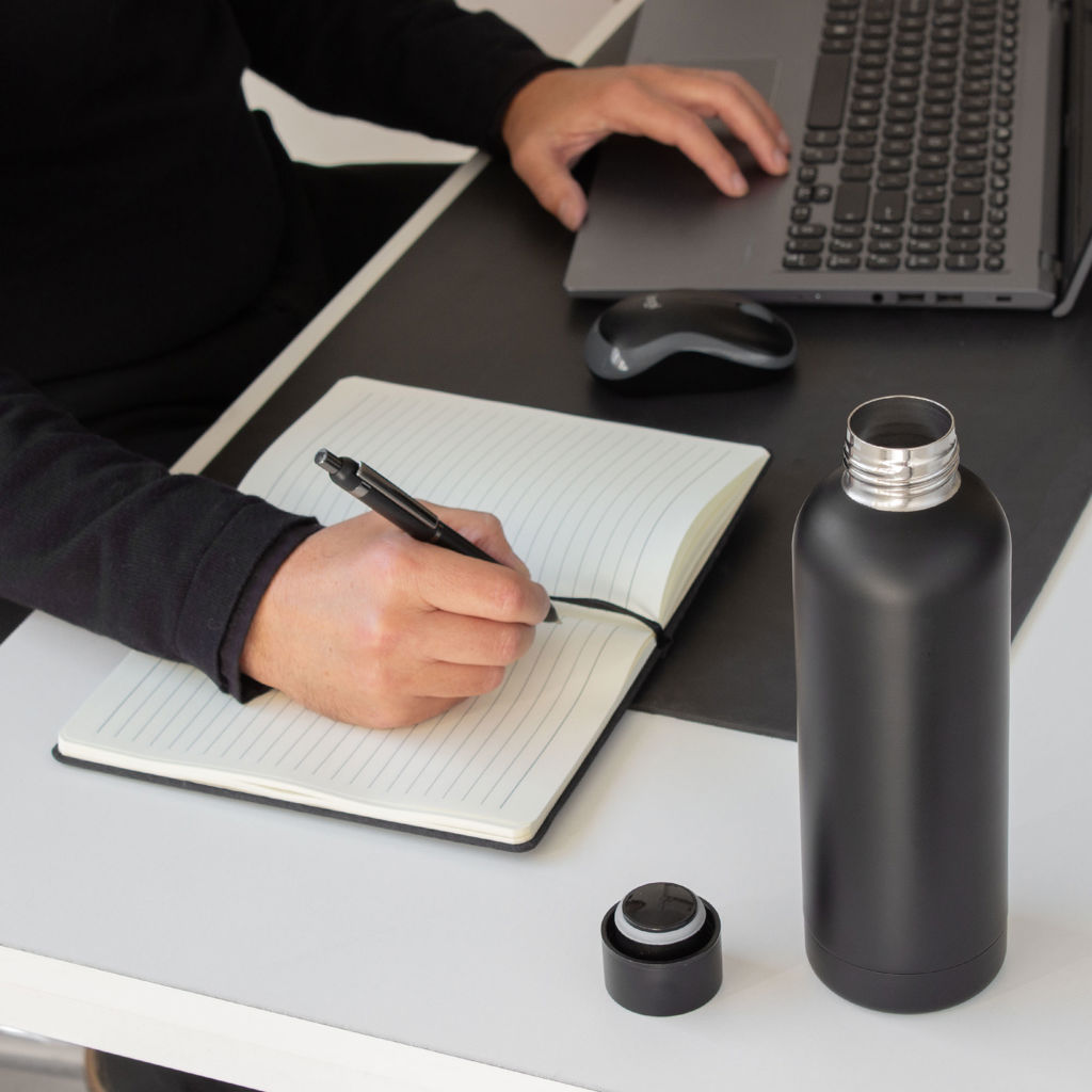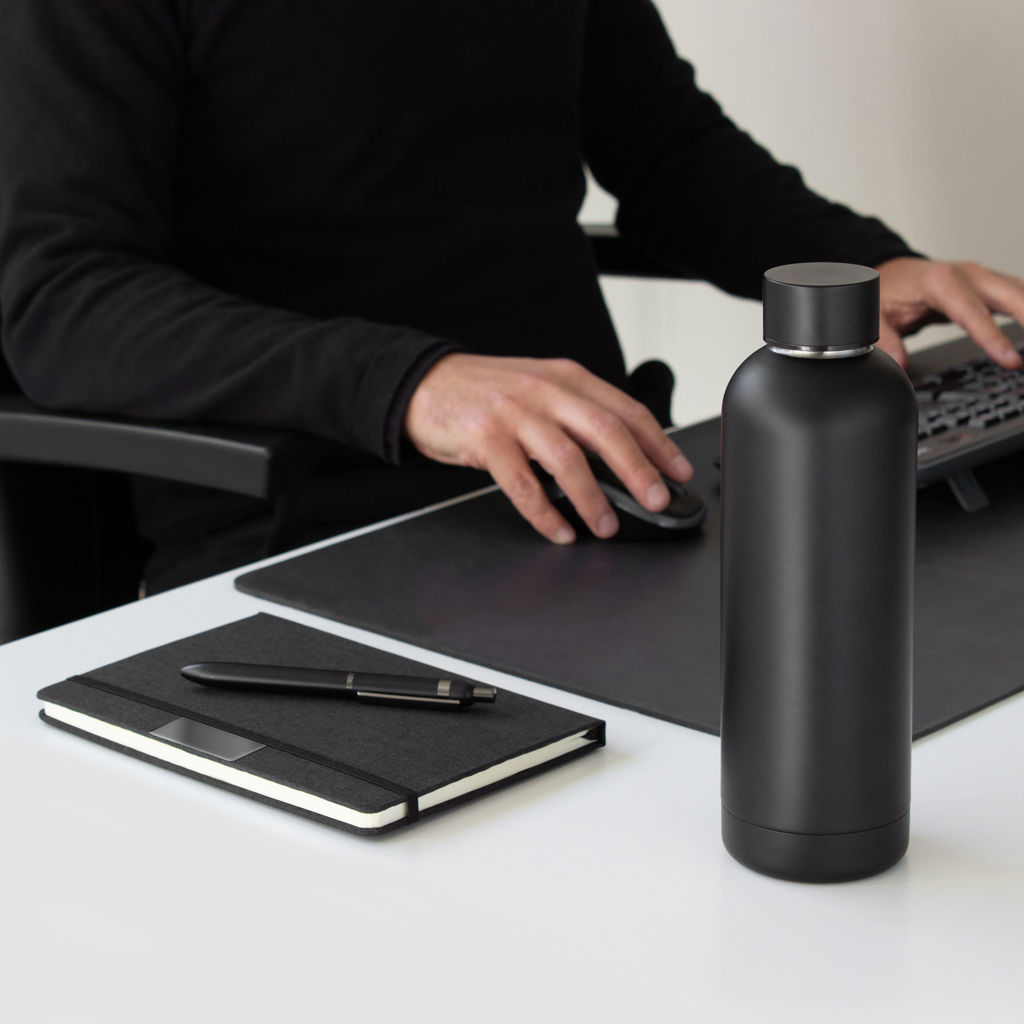 – 1 botella térmica color negro mate de 7,4 x 22 cm. y 500 ml. Doble pared, sellada al vacío. Tecnología vacuum. Interior en acero inoxidable 304 y exterior en acero inoxidable 201. Tapa a rosca de acero con anillo de silicona.Medidas: 26,5 x 30 x 7,6 cm. (caja)