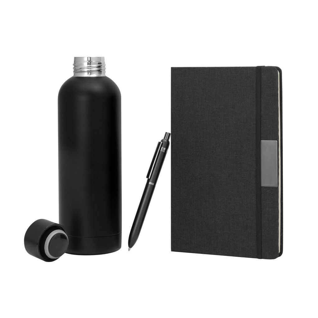 – 1 libreta color negro jaspeado de 14 x 21 x 1,5 cm. Con placa metálica color gun de 5 x 2 cm. Tapa de cartón 300g recubierta en RPET 310. Interior de 80 hojas rayadas de 70g. Encuadernación cosida y cierre con banda elástica color negro.