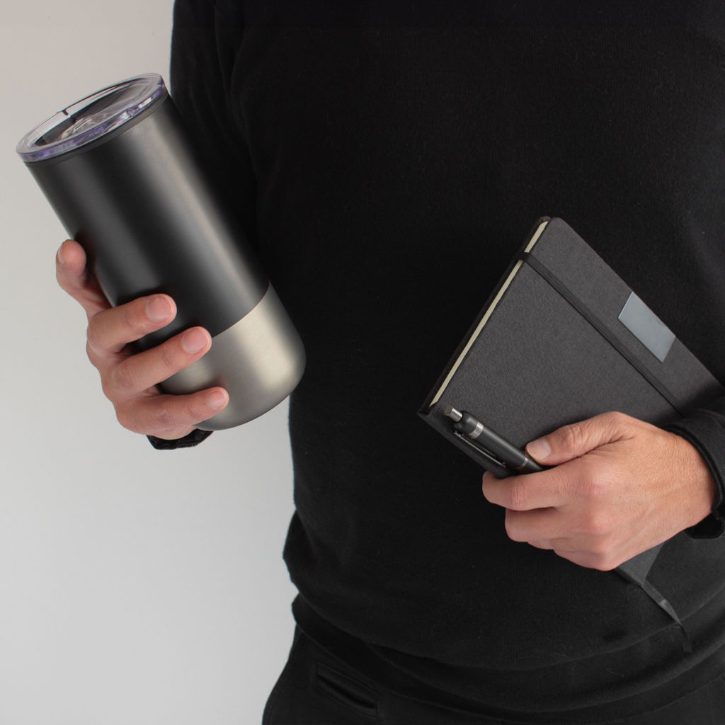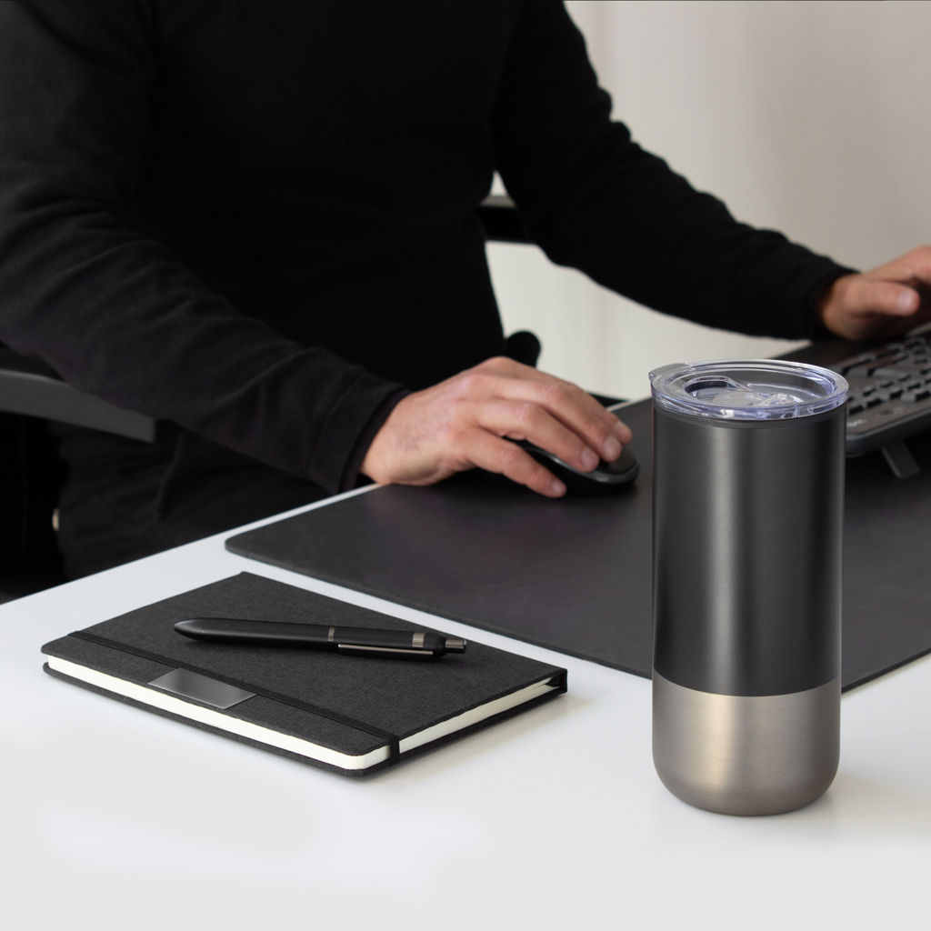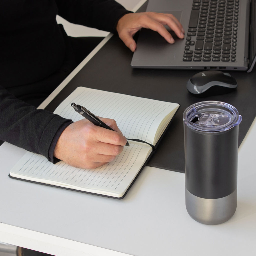 – 1 mug color negro combinado con gris gun en su base, de 8 x 17,6 cm. y 450 ml. Doble pared. Interior en polipropileno, exterior en acero inoxidable 201. Tapa plástica a presión con anillo de silicona.