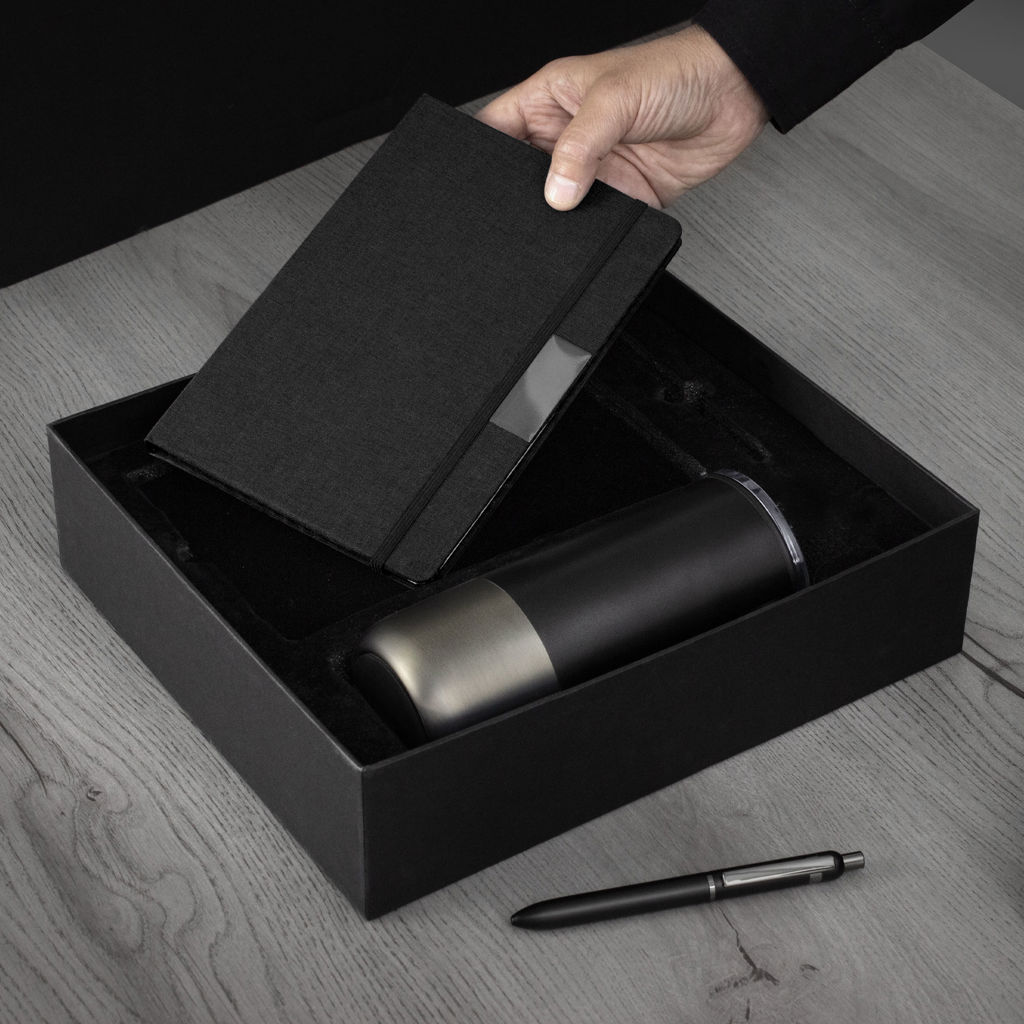 – 1 libreta color negro jaspeado de 14 x 21 x 1,5 cm. Con placa metálica color gun de 5 x 2 cm. Tapa de cartón 300g recubierta en RPET 310. Interior de 80 hojas rayadas de 70g. Encuadernación cosida y cierre con banda elástica color negro.