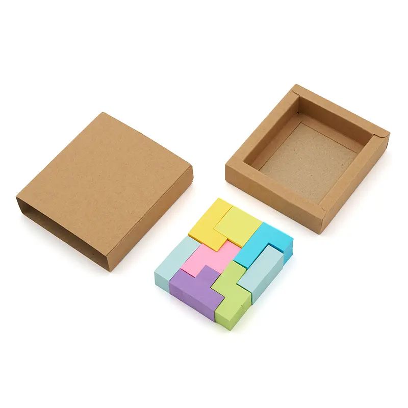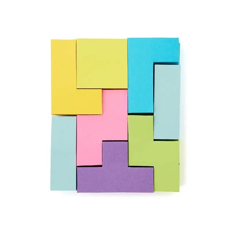 Set de notas adhesivas con diseño tipo Tetrix. La caja esta realizada de cartón reciclado; las notas adhesivas de papel offset (73 gsm); y el empaque de papel kraft (300 gsm). Cuenta con 200 mini notas adhesivas en colores y formas geométricas variadas, presentadas en caja con tapa deslizante. Es ideal para organizar ideas, marcar páginas o dejar recordatorios de forma creativa y colorida.