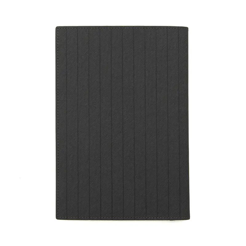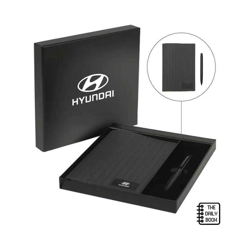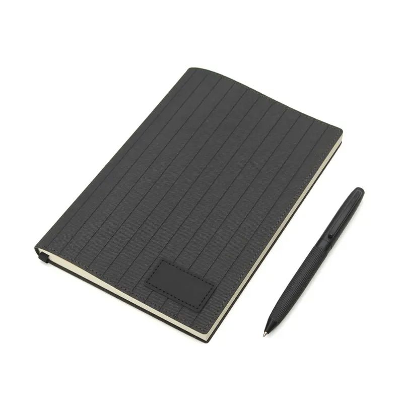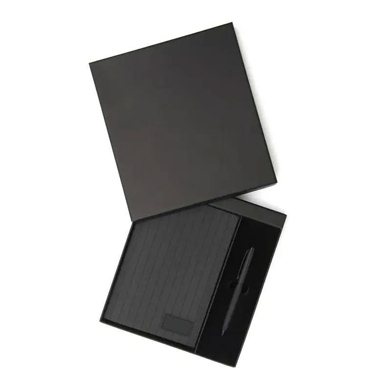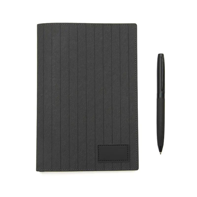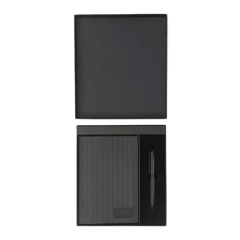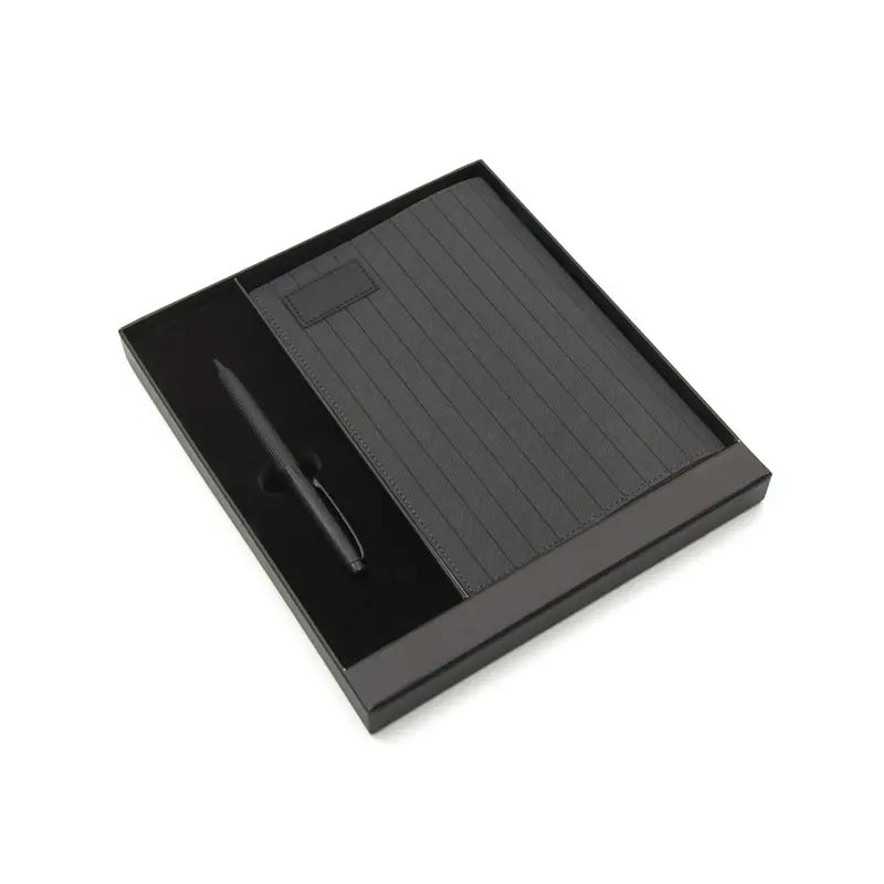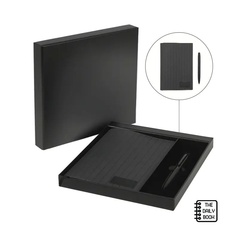 Set de cuaderno y bolígrafo fabricado con materiales de alta calidad, presentado en una caja negra laminada mate. El cuaderno está compuesto por hojas rayadas A5, cinta señaladora negra y tapa con diseño frontal lineado, mientras que el bolígrafo es metálico en color negro. Es ideal para uso profesional, reuniones de negocios, conferencias o como regalo institucional.