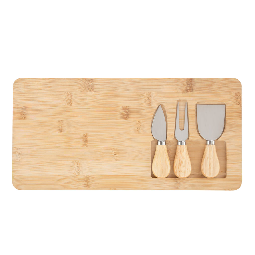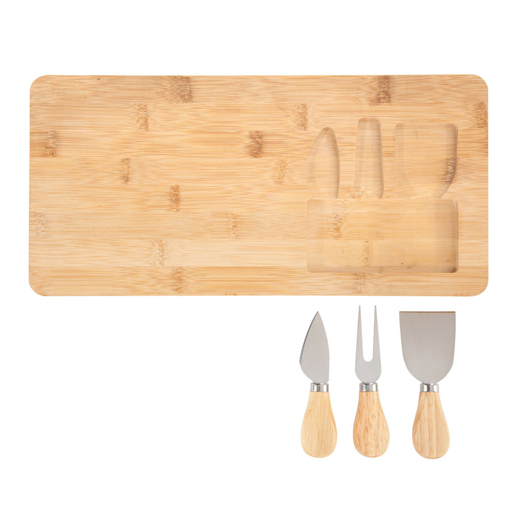 Regala funcionalidad y estilo.Tabla de bambú con set de 3 utensilios de acero inoxidable 420 con mango de madera de caucho: 1 cuchillo, 1 tenedor y 1 espátula. Medidas: 38 x 18,4 x 1,7 cm.